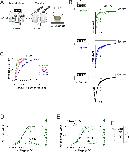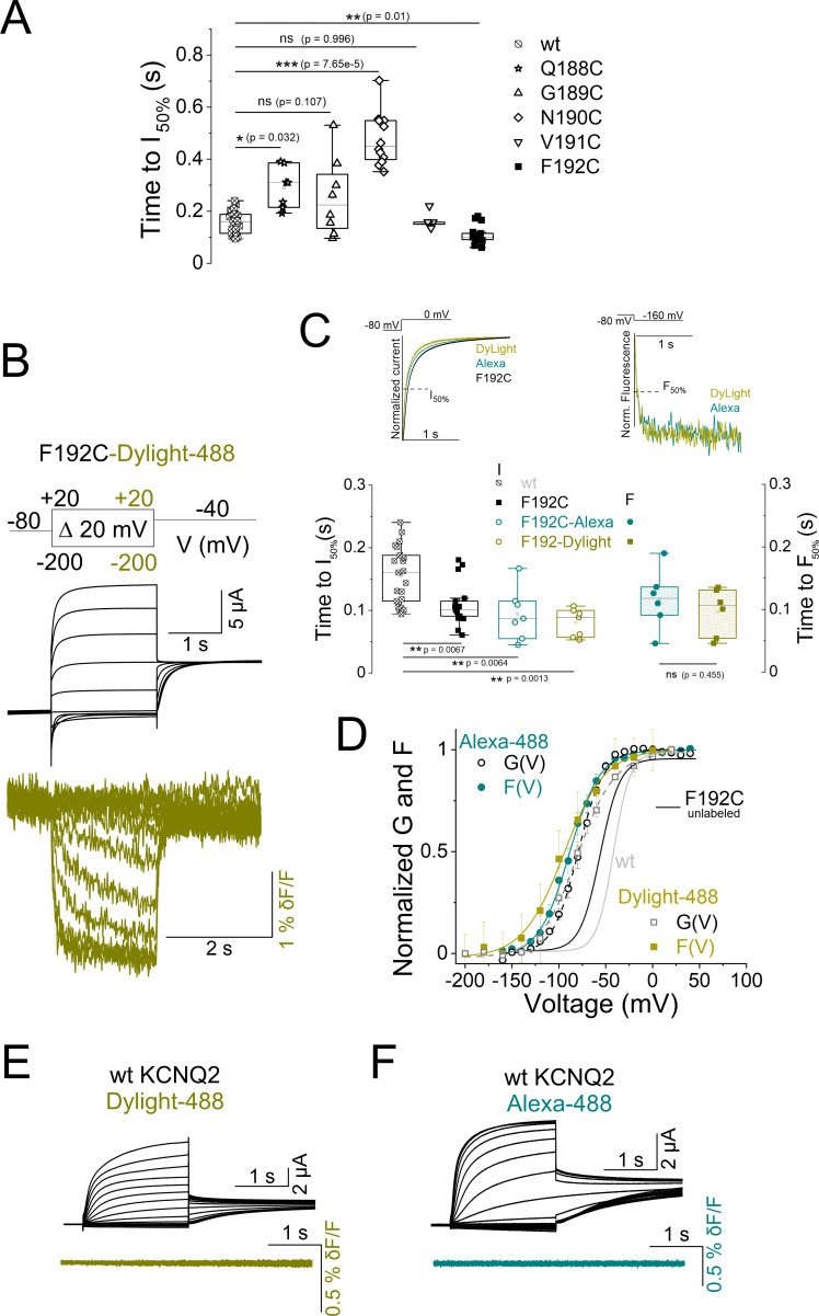 Supplementary Figure 6. Cysteine-scan mutagenesis of S3âS4 linker identifies F192C as the ideal position for fluorophore labeling. (A) Summary of the time courses of current activation for the wt and cysteine mutants quantified as the time to reach half the maximum current level at the end of the 0 mV pulse in Figure 2B. Data are presented as mean ± SEM, n=5â24. Statistical significance was determined using ANOVA and Tukeyâs post hoc test; significance level was set at p<0.05. Asterisks denote significance: p<0.05*, p<0.001***. (B) Representative (black) current and (yellow) fluorescence traces from Dylight-488-labeled KCNQ2-F192C channels (KCNQ2*) for the indicated voltage protocol (top). (C, top panels) Comparison of time courses of (left) current activation and (right) fluorescence signals from (yellow) Dylight-488 and (cyan) Alexa-488-labeled KCNQ2* channels in response to the voltage protocol shown on top. The dashed lines represent 50% of the maximum (left) current and (right) fluorescence levels at the end of the normalized pulse. The time course of current activation (black solid line) curve of unlabeled F192C is shown. (C) The time courses of (left) current and (right) fluorescence are quantified as the time to reach half the maximum current and fluorescence levels at the end of the depolarizing pulse in (C, top). For comparison, the time courses of current for the (gray) wt and (black) unlabeled F192C are also shown. Data are presented as mean ± SEM, n=8â21. Statistical significance for the current and fluorescence was determined using ANOVA and Tukeyâs post hoc test and paired-t test, respectively. Significance level was set at p<0.05. Asterisks denote significance: p<0.01**. (D) Normalized G(V) (open symbols and dashed lines from a Boltzmann fit) and F(V) (closed symbols and solid cyan and yellow lines from a Boltzmann fit) curves from (yellow) Dylight-488 and (cyan) Alexa-488-labeled KCNQ2* channels. For comparison, the G(V) relationships of (solid gray line) wt and (solid black line) unlabeled F192C channels are shown. Data are mean ± SEM, (n=8â21). The midpoints of activation for the fits are: GV1/2F192C-Alexa-488 = â77.1 ± 2.7 mV, (n=9) and FV1/2F192C-Alexa-488 = â87.1 ± 3.9 mV, (n=8), GV1/2F192C-Dylight-488 = â79.9 ± 1.4 mV, (n=11) and FV1/2F192C-Dylight-488 = â94.7 ± 1.8 mV, (n=8), GV1/2 unlabeled-F192C = â55.8 ± 0.8 mV, (n=9), and GV1/2wt = â43 ± 0.7 mV, (n=21), Supplementary file 1. (EâF) Representative (top panels) current and (bottom panels) fluorescence traces from (E) Dylight-488 and (F) Alexa-488-incubated wt-KCNQ2 channels. |