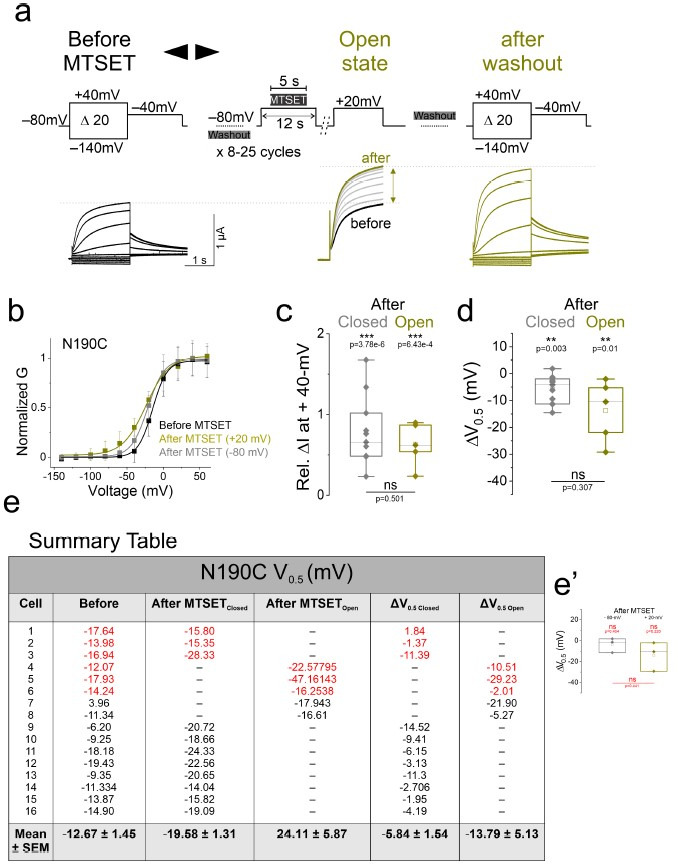 Author response image 1. (a) Currents from oocytes expressing KCNQ2-N190C channels in response to 20-mV voltage steps from – 140-mV to + 40-mV (left) before and (right) after application of MTSET in the open state. (middle) currents in response to a + 20-mV voltage steps during MTSET application on N190C channels in the open state for the indicated voltage protocol. MTSET is applied at + 20-mV for 5-s in between 25-s washouts for 8-15 cycles and the change in current is measured at + 20-mV. (b) Normalized steady-state conductance/voltage relationships, G(V), (lines from a Boltzmann fit) of N190C channels (black) before and (gray ‘closed state’ and yellow ‘open state’) after MTSET application. Summary of (c) relative change in current amplitude and (d) voltage dependence shift of MTSET-mediated modification of N190C channels in the open state. (e) Summary table of the G(V) values from each experiment. Values from the original submission are shown in red. (e’) Statistical analysis from red values. Significance was determined using the paired Student’s t-test and significance level was set at P < 0.05. Asterisks denote significance: p < 0.01**. |