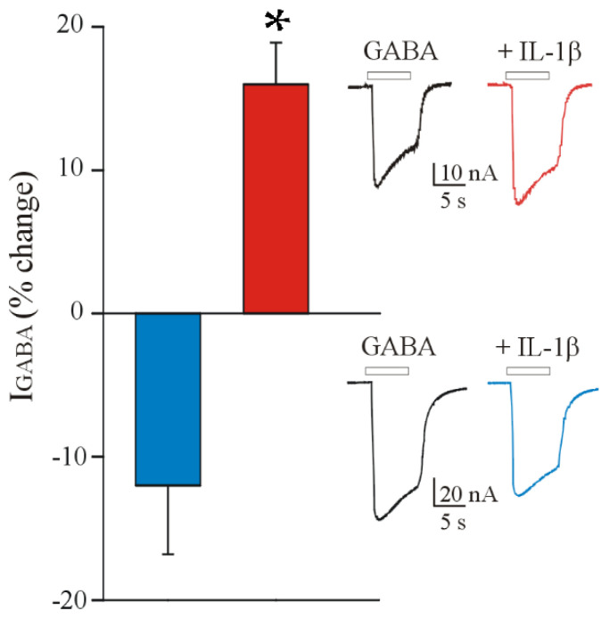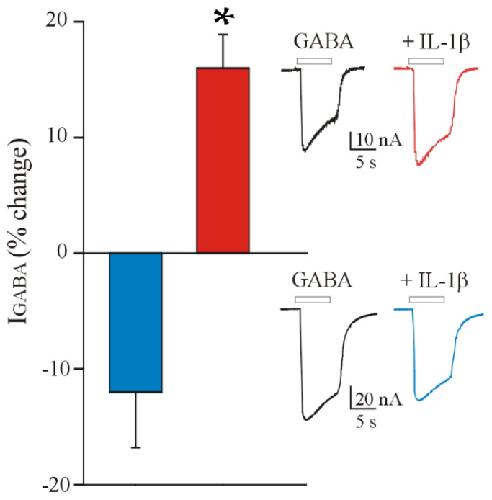 Figure 1. IL−1β potentiates GABA-evoked currents in pediatric FCD IIb tissue samples. The bar graphs show the average GABA current percent (%) changes ± s.e.m. before and after incubation with IL-1β (25 ng/mL; 2 h) in oocytes transplanted with adult FCD IIb tissues (blue bar; n = 14, # 4–6, Table 1) and pediatric FCD IIb tissues (red bar; n = 31, # 1–3, Table 1). Insets represent sample currents before (left trace) and after (right trace) incubation with IL-1β in adult (lower inset) and pediatric (upper inset) FCD IIb. White horizontal bars represent GABA application (250 μM). There is a significantly different effect of IL-1β between the two experimental groups. * p < 0.05 with Student t-test.
