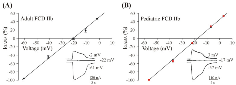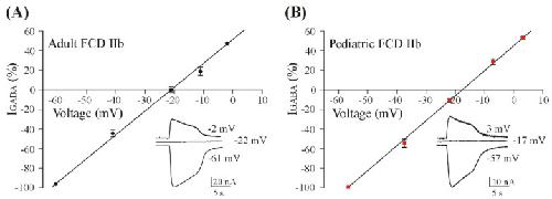 Figure 2. GABA reversal potential in FCD IIb tissue samples. The two panels represent the mean EGABA value recorded on adult (A); black circles; n = 10, # 4–6, Table 1) and pediatric (B); red squares; n = 13, # 1–3, Table 1) FCD samples. The dots represent mean ± s.e.m. of GABA currents at correspondent holding potential value (VH) normalized to the maximum currents (Imax = 73.4 for adult and 42.4 nA for pediatric). Insets represent sample GABA−evoked currents (250 μM) at different VH as shown in the respective panels. Note that the mean EGABA was significantly more depolarized in pediatric FCD tissues compared to adult FCD (p < 0.05, Wilcoxon signed rank test).