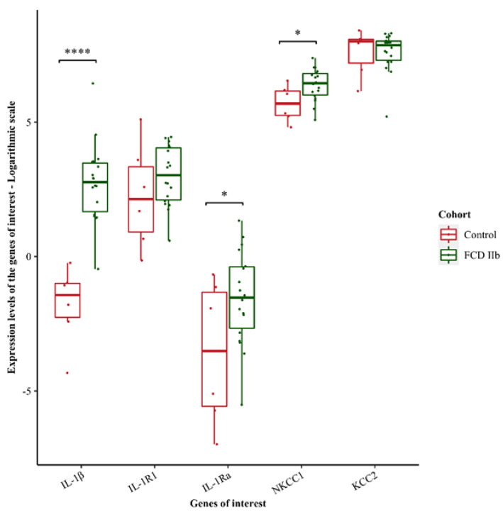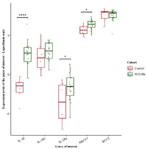 Figure 3. Expression levels of the genes of interest in FCD IIb pediatric tissue samples compared to age-matched controls. IL−1β, IL−1Ra and NKCC1 are significantly upregulated in FCD IIb pediatric tissue samples compared to controls. Expression levels are described in logarithmic scale. * p < 0.05; **** p < 0.0001. A linear model was fit for each gene and moderated t-statistic was calculated after applying an empirical Bayes smoothing to the standard errors. Those genes with a Benjamini–Hochberg adjusted p-value < 0.05 were considered significant. Differential expression analysis compared 18 FCD IIb patients and six age-matched control cortices.