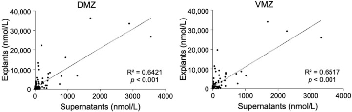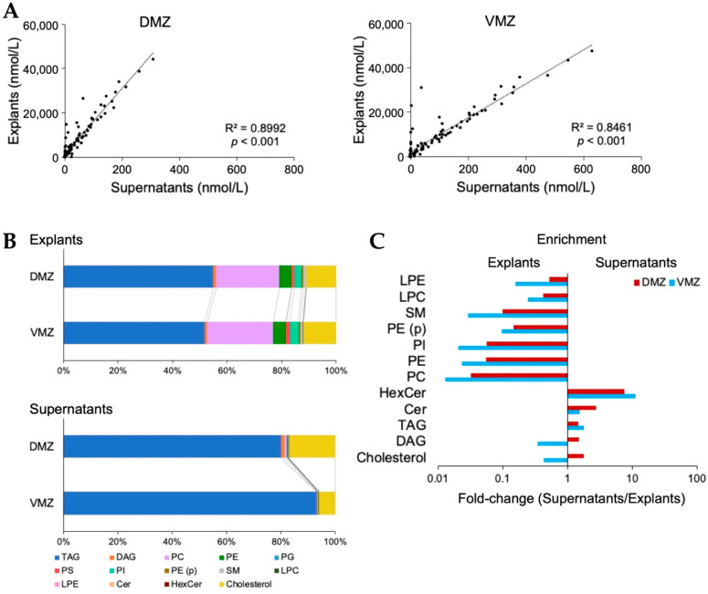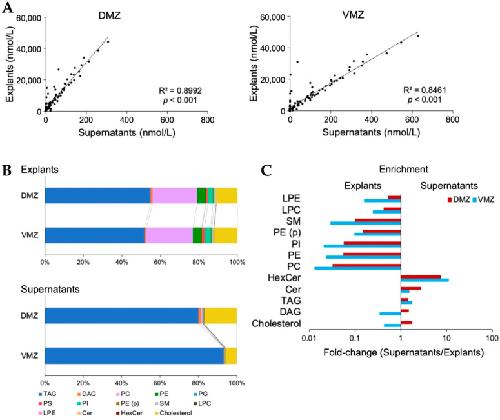 Figure 4. Lipid characteristics between the DMZ and VMZ in explants and supernatants. (A) Correlations of the lipids detected between explants and supernatants. (B) Bar graphs showing the proportion of each lipid class in the total lipid content. (C) Enrichment of lipid classes in explants and supernatants. The x-values are the ratios obtained by dividing the proportion in supernatants by that in explants. Any lipid class whose value was zero was excluded. TAG, triacylglycerol; DAG, diacylglycerol; PC, phosphatidylcholine; PE, phosphatidylethanolamine; PG, phosphatidylglycerol; PS, phosphatidylserine; PI, phosphatidylinositol; PE (p), alkenyl-acyl phosphatidylethanolamine; SM, sphingomyelin; LPC, lysophosphatidylcholine; LPE, lysophosphatidylethanolamine; Cer, ceramide; HexCer, hexosylceramides.