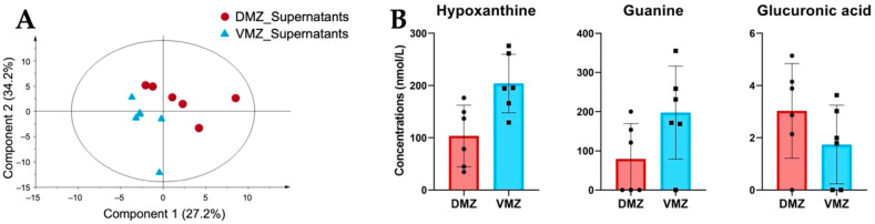 Figure 3. Comparative analysis of the characteristic hydrophilic metabolites identified in supernatants. (A) PLS-DA score plots for the supernatants of the DMZ (red circle) and VMZ (blue triangle) samples (DMZ and VMZ supernatants) based on hydrophilic metabolite data. (B) Comparison of hypoxanthine, guanine, and glucuronic acid concentrations in the DMZ and VMZ supernatants. Symbols represent each sample and the bar graph indicates the mean ± SD (n = 6, each sample from 20 explants).