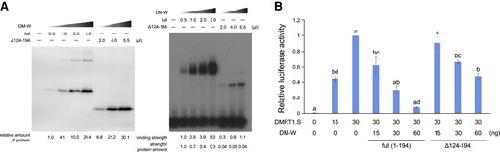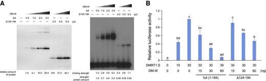 Fig. Effects of the transposon-derived Ex4 coding region in in vitro DNA binding and transrepression activities of DM-W. (A) In vitro DNA binding of DM-W (full length) and its C-terminal truncated protein, DM-W (Δ124–194), to the DMRT1-binding sequence. Flag-DM-W(full) and Flag-DM-W(Δ124–194) were produced by in vitro transcription–translation system and analyzed by Western blot analysis with an anti-FLAG antibody followed by an HRP-conjugated antimouse antibody (left). The relative intensity values were shown below. EMSA was performed using in vitro synthesized Flag-DM-W(full) (0.5, 1.0, 2.0, or 3.0 μl) or Flag-DM-W(Δ124–194) (2.0, 4.0, or 5.5 μl) and 32P-labeled double-stranded oligonucleotides containing the DMRT1-binding sequence. The relative intensity values to the protein amounts, binding strength, and ratio of strength/protein amount were shown below. (B) The luciferase reporter assay for the DM-W transrepression activity on DMRT1-driven transcription. The DMRT1-driven luciferase reporter and an expression plasmid for DMRT1.S and DM-W(full) or DM-W(Δ124–194) were transfected into HEK293T cells and posttransfection (24 h) luciferase activity was measured. Letters (a–d) indicate significant differences based on a one-way ANOVA, followed by the Tukey–Kramer HSD test (P < 0.01).