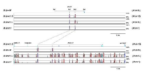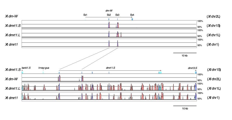 VISTA plots of the four genomic regions (100 kb of Scaffold78 on Xl chr2L, 96 kb on Xl chr1L, 75 kb on Xl chr1S, and 73 kb on Xt chr 1) were constructed by using Xl dm-W (upper panel) and Xl dmrt1.S (lower panel), respectively, as references. Dark blue and light blue indicate homologous coding and non-coding exons of genes, respectively. Pink shows conserved non-CDSs.