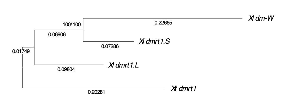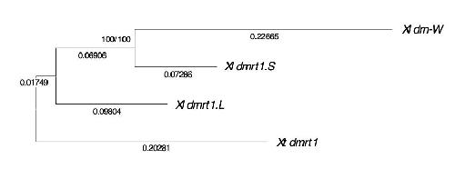 Supplementary fig. 3. A phylogenetic tree of the regions containing the DM domain-coding sequences among X. laevis (Xl) dm-W, dmrt1.S, dmrt1.L, and X. tropicalis (Xt) dmrt1