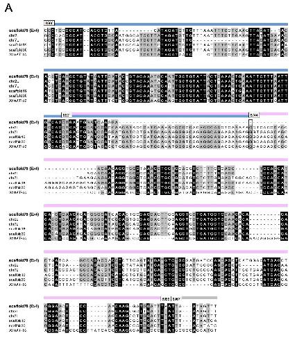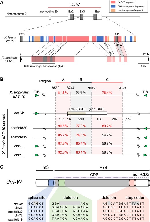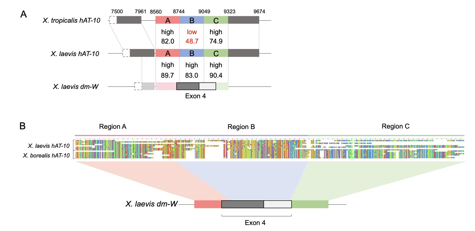 (A) Sequence alignments of the regions A, and a part of B (see Fig. 1) among the five X. laevis hAT-10-derived sequences on dm-W-containing scaffold 78, chromosome 2L, chromosome 7L, scaffold 19, and scaffold 30, and X. tropicalis hAT-10. Identical nucleotides among all the five sequences and four sequences are shown by white letters on black background and black letters on grey background, respectively. The numbers on the alignments indicate those corresponding to Xt hAT-10 sequence. Pale blue, pink and grey horizontal lines indicate the homologous region with Xt hAT-10 sequence, Xl dm-W Ex4 CDS, and its non-CDS, respectively.