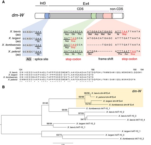 The nucleotide and deduced amino acid sequence alignments of the Ex4-CDS of dm-W among four allopolyploid Xenopus species. (A) A multiple nucleotide sequence alignment within and adjacent to Ex4-CDS of X. laevis, X. largeni (MCZ-A cryogenic 333), X. itombwensis (MCZ-A A136197), and X. petersii. Red font highlights the positions of TAG and TAA stop codons. (B) A multiple alignment of the Ex4-encoded amino acid sequences from the four DNA sequences in (A) (upper) and the ML phylogenetic tree of the Ex4 sequences and/or their corresponding hAT-10-derived sequences from X. laevis, X. largeni, X. itombwensis, and X. petersii (lower). Numbers at each node denote the ML/NJ bootstrap percentages of 1000 replicates.