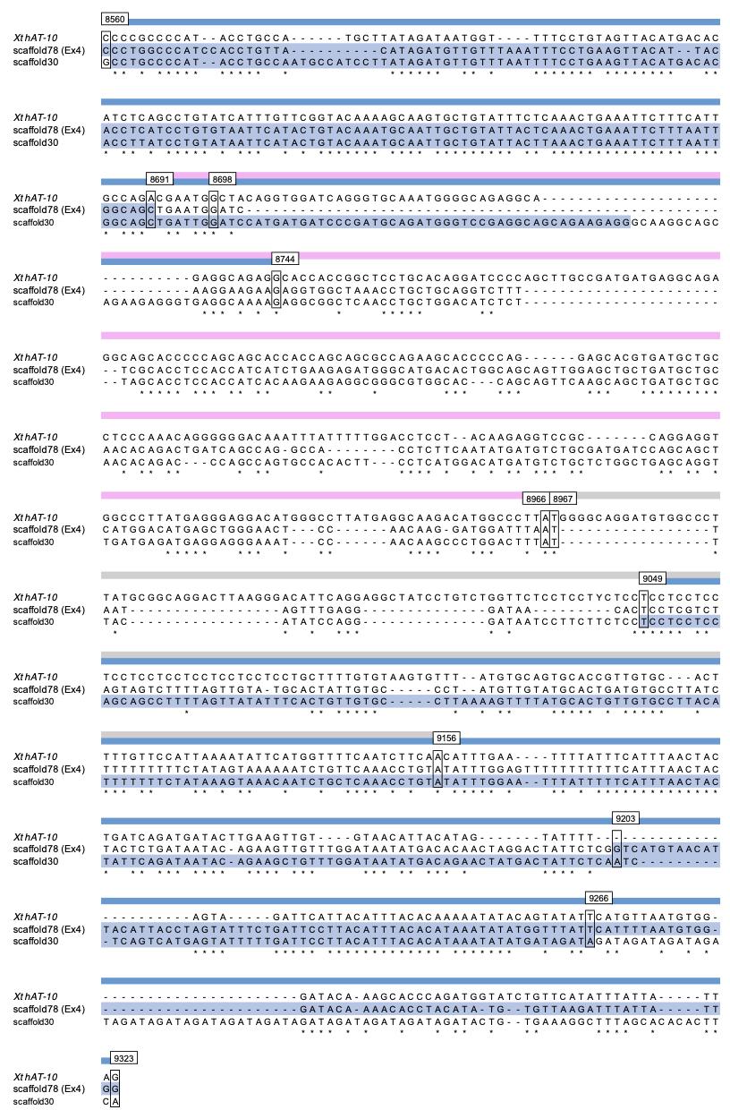 (B) Sequence alignments of the regions A, B, and a part of C (see Fig. 1) among the three hAT-10-derived sequences on dm-W-containing scaffold 78, scaffold30 and Xt hAT-10. Pale blue, pink and grey show the same as in (A). Nucleotide sequences in pale blue-violet shading indicate the region which was recognized as Xt hAT-10 sequence by CENSOR program. Asterisks represent identical nucleotides among the three.