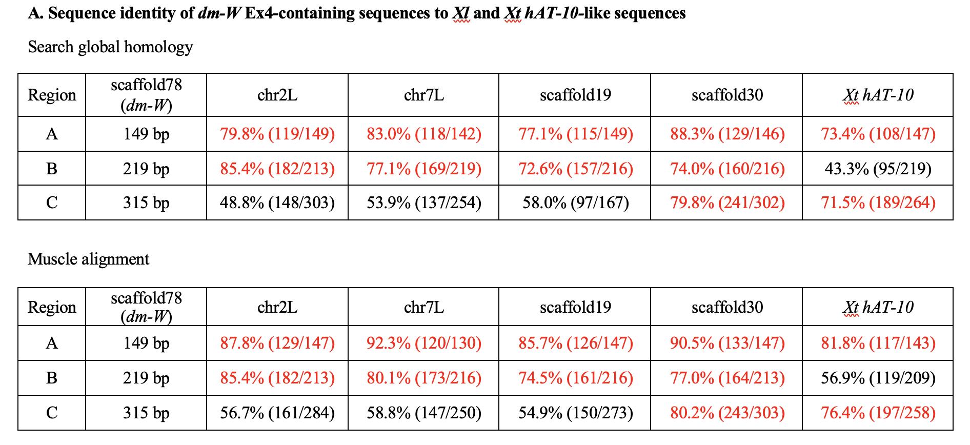 A. Sequence identity of dm-W Ex4-containing sequences to Xl and Xt hAT-10-like sequences
