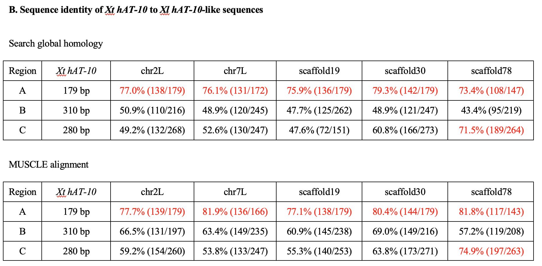 B. Sequence identity of Xt hAT-10 to Xl hAT-10-like sequences