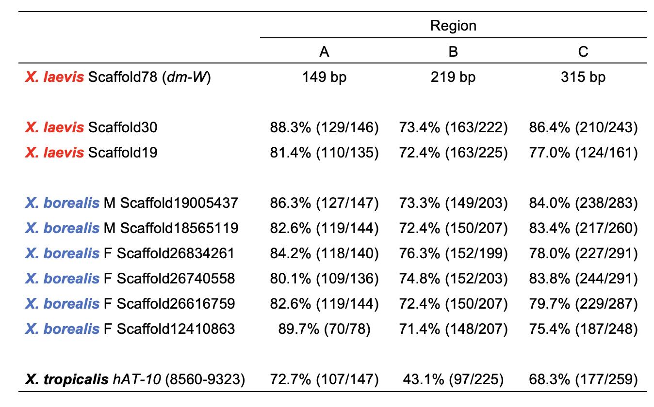 Supplementary Table 2. Nucleotide sequence identity (%) of three regions A - C for comparisons between dm-W and X. borealis hAT-10-like sequences