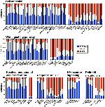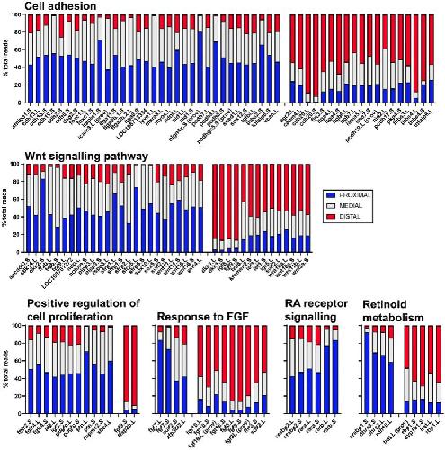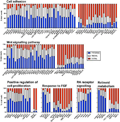 Figure 5. Relative distribution of read counts for genes in differentially expressed gene ontology gene sets for cell adhesion, Wnt signaling pathway, positive regulation of cell population proliferation, response to fibroblast growth factor, retinoic acid receptor signaling, and retinoid metabolism. Stacked graphs show the percentage of proximal reads is in blue, medial reads in grey, and distal in red. Genes with statistically more reads in distal than proximal are on the left and those more proximal on the right, and are ordered alphabetically within each group. |