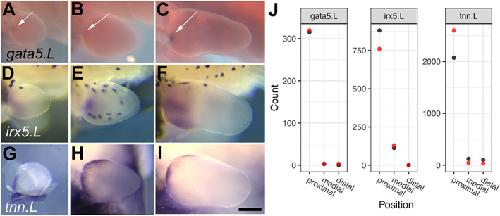 Figure 2. Expression of three cluster 4 proximal genes in X. laevis hind limb buds. (A-I) Whole mount in situ hybridization (purple staining) of stages 50 to 52 hind limb buds as viewed from the dorsal side, posterior uppermost. (A-C) white arrows indicate proximal spot of mesenchymal gata5.L at stage 50 (A), 51 (B), and 52 (C). (D-F) irx5.L in the proximal mesenchyme at stage 50 (D), 51 (E), and 52 (F). Black stellate cells are melanophores in nonalbino tadpoles (D-F), expression in stage 52 is anterior as well as proximal. (G-I) Expression of tnn.L is very strong along the boundary with the body wall, and is epithelial. Stage 50 limb bud dissected to enable visualization of limb bud, as there is strong expression in the ventral fin as well as the limb bud (G), stage 51 (H), and 52 (I). Scale bar in (I) is 250âμM and applies to all panels. (J), Normalized read counts of gata5.L, irx5.L and tnn.L in the three sections of the stage 51 limb bud transcriptome. Red and black dots indicate biological replicate data, where only red can be seen it overlaps completely with black |