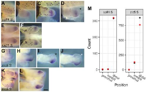 Figure 4. Expression of two distal mesenchymal genes in X. laevis hindlimb buds. (A-L) Whole mount in situ hybridization where expression is indicated by dark purple staining. (A-F) expression of sall1.S. (A-D) Dorsal views of the limb with distal to the right and posterior uppermost. (A): stage 50, (B): stage 51, (C): stage 52, (D): stage 53. (E and F) Views of the distal limb, the ventral midline of the tadpole running left to right in the center of the image. (G-L) Expression of zic5.S indicated by dark purple staining. (G-J) Dorsal views of the limb. (G): stage 51, (H): stage 52, (I): stage 53, (J): stage 54. (K and L) Views of the distal limb, (K): stage 51, (L) stage 54. Asterisk indicates the approximate location of digit IV in stage 53 and above limb buds. Melanophores are present on some limb buds (A-D, F, G, and K) as black stellate cells. Scale bar in (L) is 250âμM and applies to all panels. (M) Normalized read counts of sall1.S and zic5.S in the three sections of the stage 51 limb bud transcriptome, red and black indicate biological replicate data, where only red can be seen it overlaps completely with black |