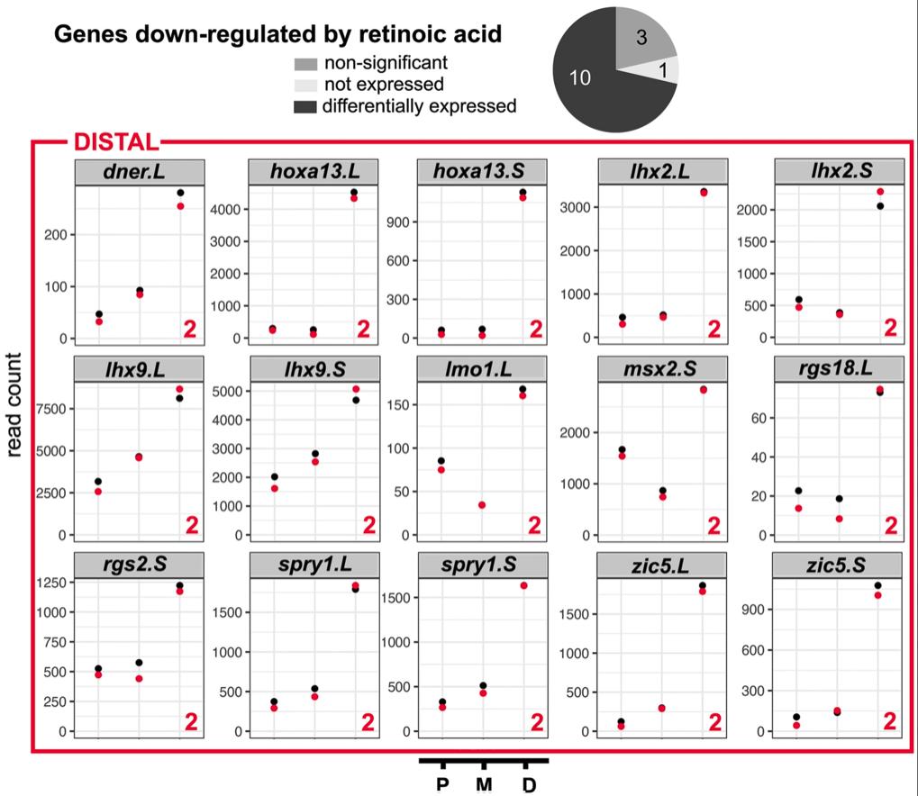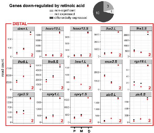 Figure 7. Distal gene expression in stage 51 Xenopus hindlimb bud of genes previously shown to be downregulated by retinoic acid in axolotls. Pie chart: 14 different genes identified as downregulated by RA in axolotls18 were identified as not expressed (not found in Xenopus stage 51 limb bud), nonsignificant (expression is not significantly different across the three limb bud sections) or differentially expressed. Homologs of the 10 differentially expressed genes in the allotetraploid Xenopus laevis are found exclusively in cluster 2. Cluster number is indicated by colored number at the base of each graph, read counts are shown on the y-axis and position on the x-axis. Replicates are represented by red and black dots and where only one dot can be seen, these overlap completely. P = proximal, M = medial, D = distal. Colored box indicates all genes had distal expression patterns |