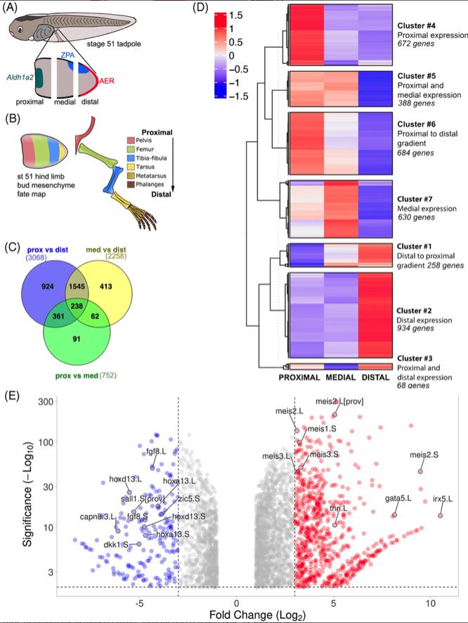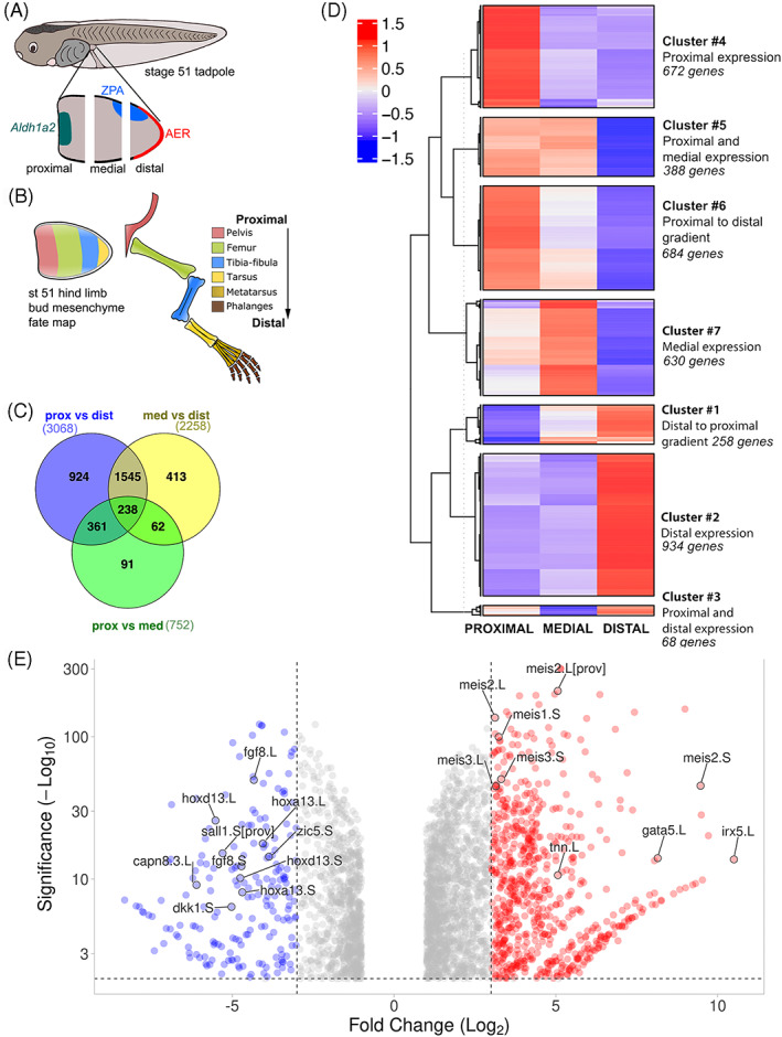 FIGURE 1. Transcriptome analysis of three regions of the early Xenopus laevis hindlimb bud proximal to distal axis. (A) Schematic of sample preparation. Stage 51 hindlimb buds were divided into three equal sections along the proximal to distal axis, each part is approximately 200 μM wide. Approximate locations of the apical ectodermal ridge (AER) and zone of polarizing activity (ZPA) are indicated in red and blue, respectively. Location of a potential proximal source of the morphogen retinoic acid is indicated by expression of Aldh1a2 in green. (B) Fate map showing the contribution of developing stage 51 X. laevis hindlimb bud mesenchyme to skeletal elements of the limb, according to Tschumi. 8 (C) Venn diagram of all significantly differentially expressed genes using Venny 2.0. 86 (D) Dendrogram heatmap showing hierarchical clustering of the differentially expressed genes, selecting for seven clusters. (E) Volcano plot showing the relative distributions of known proximal (red: meis1, meis2) and distal (blue: fgf8, hoxa13, hoxd13) limb genes as well as the genes verified by whole mount in situ hybridization in Figures 2, 3, 4). Genes with log2 fold change <3 in either direction are represented by grey dots |