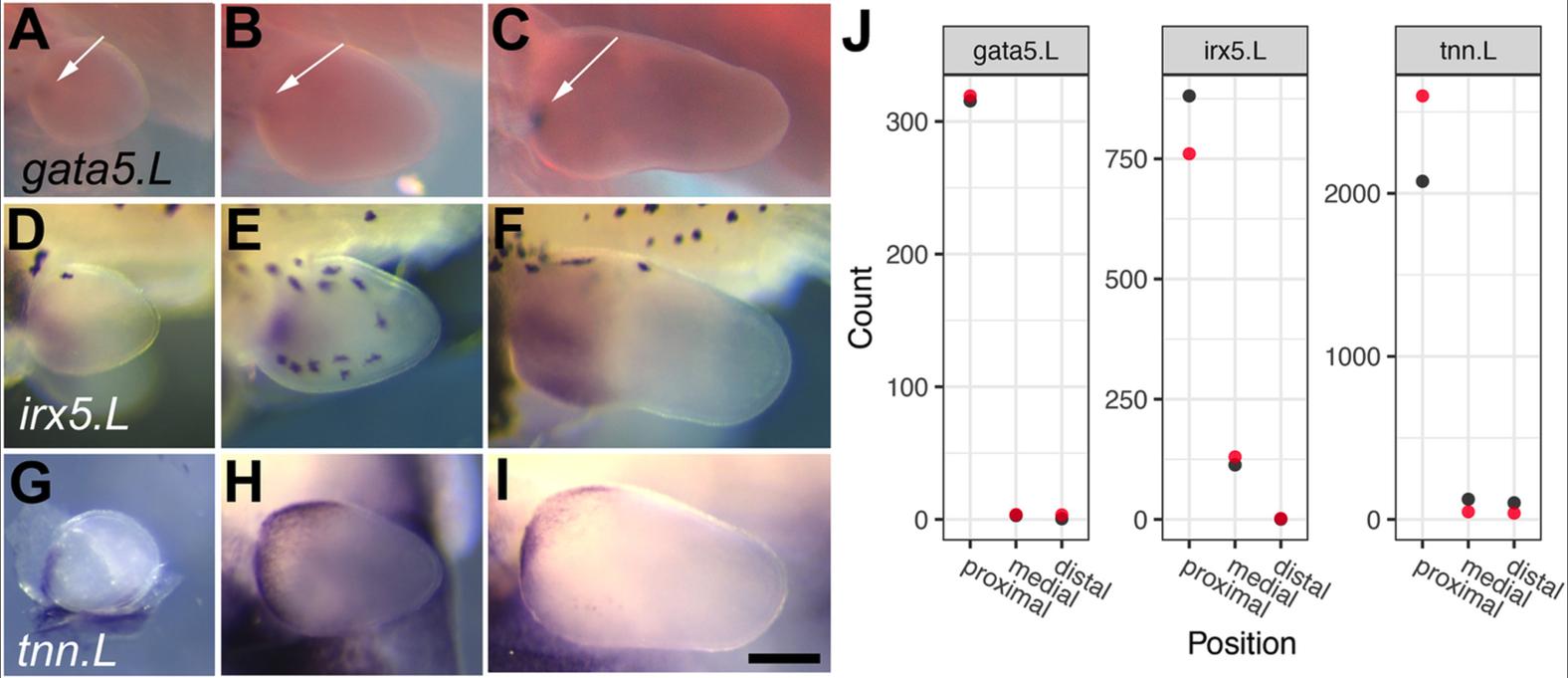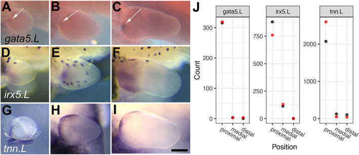FIGURE 2. Expression of three cluster 4 proximal genes in X. laevis hind limb buds. (A‐I) Whole mount in situ hybridization (purple staining) of stages 50 to 52 hind limb buds as viewed from the dorsal side, posterior uppermost. (A‐C) white arrows indicate proximal spot of mesenchymal gata5.L at stage 50 (A), 51 (B), and 52 (C). (D‐F) irx5.L in the proximal mesenchyme at stage 50 (D), 51 (E), and 52 (F). Black stellate cells are melanophores in nonalbino tadpoles (D‐F), expression in stage 52 is anterior as well as proximal. (G‐I) Expression of tnn.L is very strong along the boundary with the body wall, and is epithelial. Stage 50 limb bud dissected to enable visualization of limb bud, as there is strong expression in the ventral fin as well as the limb bud (G), stage 51 (H), and 52 (I). Scale bar in (I) is 250 μM and applies to all panels. (J), Normalized read counts of gata5.L, irx5.L and tnn.L in the three sections of the stage 51 limb bud transcriptome. Red and black dots indicate biological replicate data, where only red can be seen it overlaps completely with black |