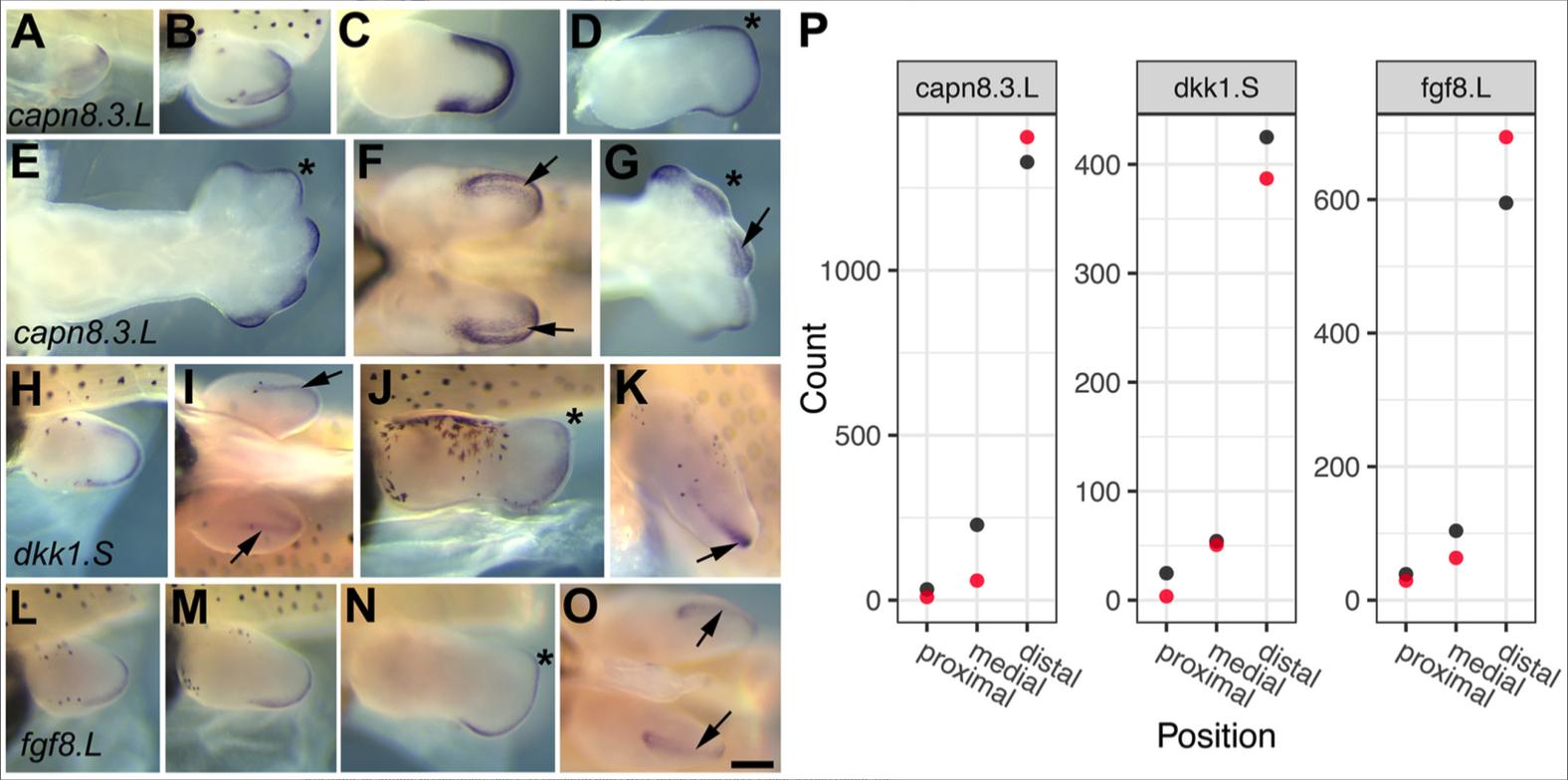 Figure 3. Expression of distal epithelial genes in X. laevis hindlimb buds. (A-O) Whole mount in situ hybridization, gene expression is marked by dark purple staining. (A-G) Capn8.3L is expressed in the epithelial cells flanking the AER. (A-E) Dorsal view of limb with distal to the right and posterior uppermost. (A): stage 50, (B): stage 51, (C): stage 52, (D): stage 53, (E): stage 55. (F and G) Views of the distal limb(s) to show the AER (black arrow), (F): stage 53, (G): stage 55. (H-K) Expression of dkk1.S (H): stage 51, dorsal view, (I): distal view, (J): stage 53 dorsal view, (K): distal view. (L-O) expression of fgf8 (L): stage 51 dorsal view, (M) stage 52 dorsal view, (N): stage 53 dorsal view, (O): stage 53 distal view. Black arrows indicate the AER in distal views, and the approximate position of digit IV is indicated by an asterisk from stage 53. Black stellate cells are melanophores in non-albino tadpoles (B, H-M). Scale bar in (O) is 250âμM and applies to all panels. (P) Normalized read counts of capn8.3.L, dkk.S and fgf.S in the three sections of the stage 51 limb bud transcriptome, red and black indicate biological replicate data |
