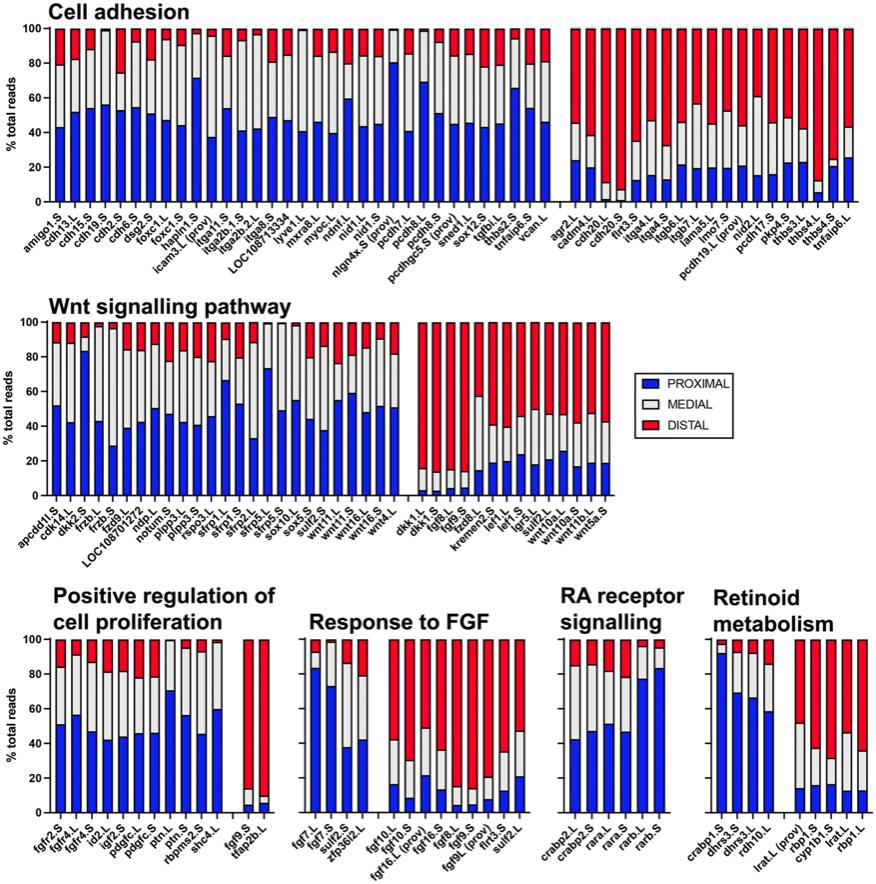 FIGURE 5. Relative distribution of read counts for genes in differentially expressed gene ontology gene sets for cell adhesion, Wnt signaling pathway, positive regulation of cell population proliferation, response to fibroblast growth factor, retinoic acid receptor signaling, and retinoid metabolism. Stacked graphs show the percentage of proximal reads is in blue, medial reads in grey, and distal in red. Genes with statistically more reads in distal than proximal are on the left and those more proximal on the right, and are ordered alphabetically within each group. |
