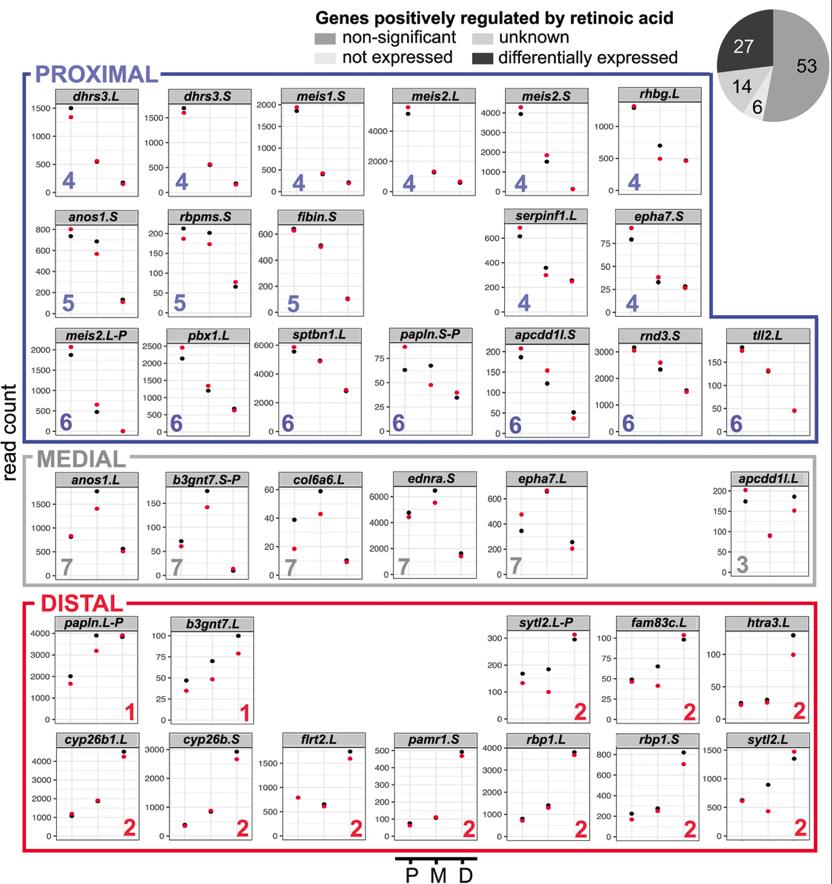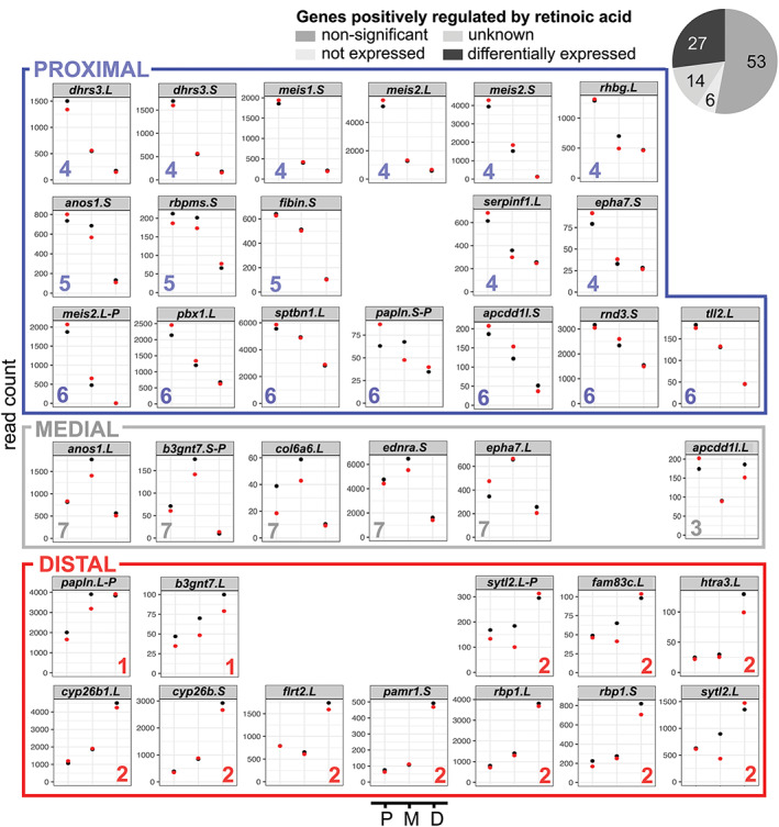 Figure 6. Genes previously shown to be upregulated by retinoic acid in axolotl limbs do not show consistent expression distributions in Xenopus limbs. One hundred different genes identified as upregulated by RA in axolotl limb18 were identified one of four categories: unknown (no Xenopus homologue), not expressed (not found in Xenopus stage 51 limb bud), nonsignificant (expression is not significantly different across the three limb bud sections) or differentially expressed. Homologs of the 27 differentially expressed genes in the allotetraploid Xenopus laevis are found in all seven clusters, cluster number is indicated by colored number at the base of each graph, read counts are shown on the y-axis and position on the x-axis. P = proximal, M = medial, D = distal. Replicates are represented by red and black dots and where only one dot can be seen, these overlap completely. Colored boxes are used to group clusters with proximal, distal or medial/terminal expression patterns |