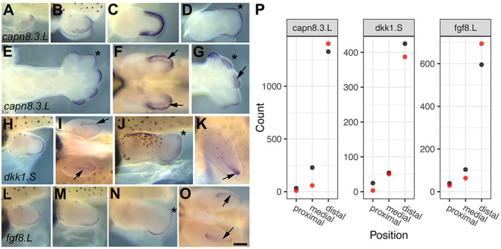 FIGURE 3. Expression of distal epithelial genes in X. laevis hindlimb buds. (A‐O) Whole mount in situ hybridization, gene expression is marked by dark purple staining. (A‐G) Capn8.3L is expressed in the epithelial cells flanking the AER. (A‐E) Dorsal view of limb with distal to the right and posterior uppermost. (A): stage 50, (B): stage 51, (C): stage 52, (D): stage 53, (E): stage 55. (F and G) Views of the distal limb(s) to show the AER (black arrow), (F): stage 53, (G): stage 55. (H‐K) Expression of dkk1.S (H): stage 51, dorsal view, (I): distal view, (J): stage 53 dorsal view, (K): distal view. (L‐O) expression of fgf8 (L): stage 51 dorsal view, (M) stage 52 dorsal view, (N): stage 53 dorsal view, (O): stage 53 distal view. Black arrows indicate the AER in distal views, and the approximate position of digit IV is indicated by an asterisk from stage 53. Black stellate cells are melanophores in non‐albino tadpoles (B, H‐M). Scale bar in (O) is 250 μM and applies to all panels. (P) Normalized read counts of capn8.3.L, dkk.S and fgf.S in the three sections of the stage 51 limb bud transcriptome, red and black indicate biological replicate data |