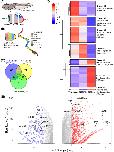 Figure 1. Transcriptome analysis of three regions of the early Xenopus laevis hindlimb bud proximal to distal axis. (A) Schematic of sample preparation. Stage 51 hindlimb buds were divided into three equal sections along the proximal to distal axis, each part is approximately 200âμM wide. Approximate locations of the apical ectodermal ridge (AER) and zone of polarizing activity (ZPA) are indicated in red and blue, respectively. Location of a potential proximal source of the morphogen retinoic acid is indicated by expression of Aldh1a2 in green. (B) Fate map showing the contribution of developing stage 51 X. laevis hindlimb bud mesenchyme to skeletal elements of the limb, according to Tschumi.8 (C) Venn diagram of all significantly differentially expressed genes using Venny 2.0.86 (D) Dendrogram heatmap showing hierarchical clustering of the differentially expressed genes, selecting for seven clusters. (E) Volcano plot showing the relative distributions of known proximal (red: meis1, meis2) and distal (blue: fgf8, hoxa13, hoxd13) limb genes as well as the genes verified by whole mount in situ hybridization in Figures 2-4). Genes with log2 fold change <3 in either direction are represented by grey dots |