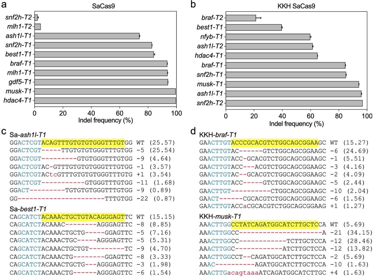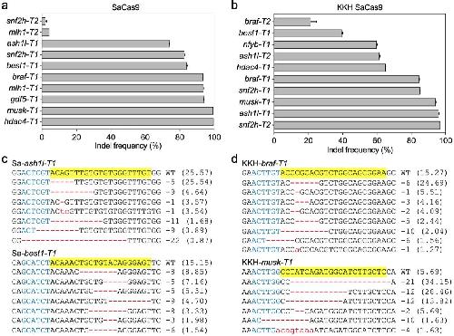 Figure 2. SaCas9 and KKH SaCas9 are efficient and robust tools for genome editing in X. tropicalis. a SaCas9 induced efficient targeted gene disruption in X. tropicalis embryos. b KKH SaCas9 induced efficient targeted gene disruption in X. tropicalis embryos. c, d Deep-sequencing data show some of the mutations induced by SaCas9 and KKH SaCas9. For all the panels, the wild-type sequence is shown at the top with the target site highlighted in yellow and the PAM sequence in blue text. Red dashes indicate deletions and lowercase letters in red indicate insertions or mutations. The numbers in parentheses show the percentage of this sequence in the total sequence reads. For target site designation, the gene name is in the middle, the prefixes Sa- and KKH- represent SaCas9 and KKH SaCas9, respectively. The suffixes -T1 and -T2 represent the first and the second target site designed in a given gene, respectively