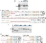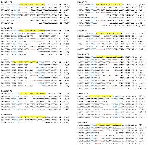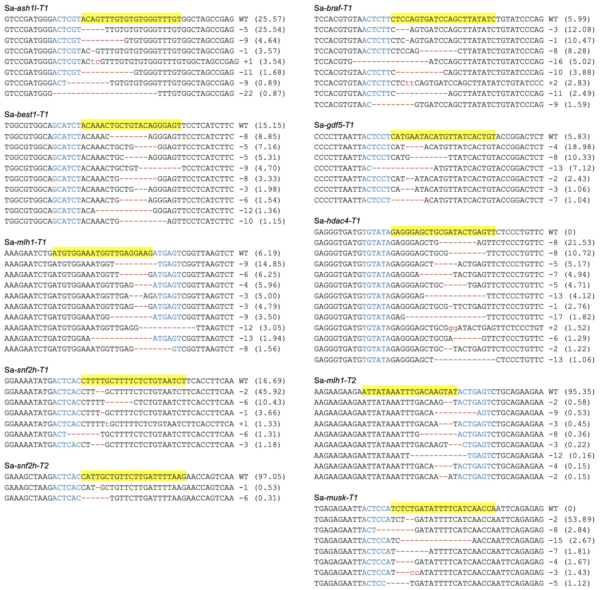 Fig. S1. DNA deep-sequencing data show the mutations induced by SaCas9 targeting the genes showed in Fig. 2a. For all the panels, the wild-type sequence is shown at the top with the target site highlighted in yellow and the PAM sequence in blue text. Red dashes indicate deletions and lowercase letters in red indicate insertions or mutations. The numbers in parentheses show the percentage of this sequence in total sequencing reads. For target site designation, the gene name is in the middle, the prefix Sa- represents SaCas9. The suffixes -T1 and -T2 represent the first and the second target site designed in a given gene, respectively.