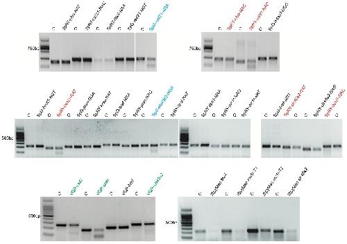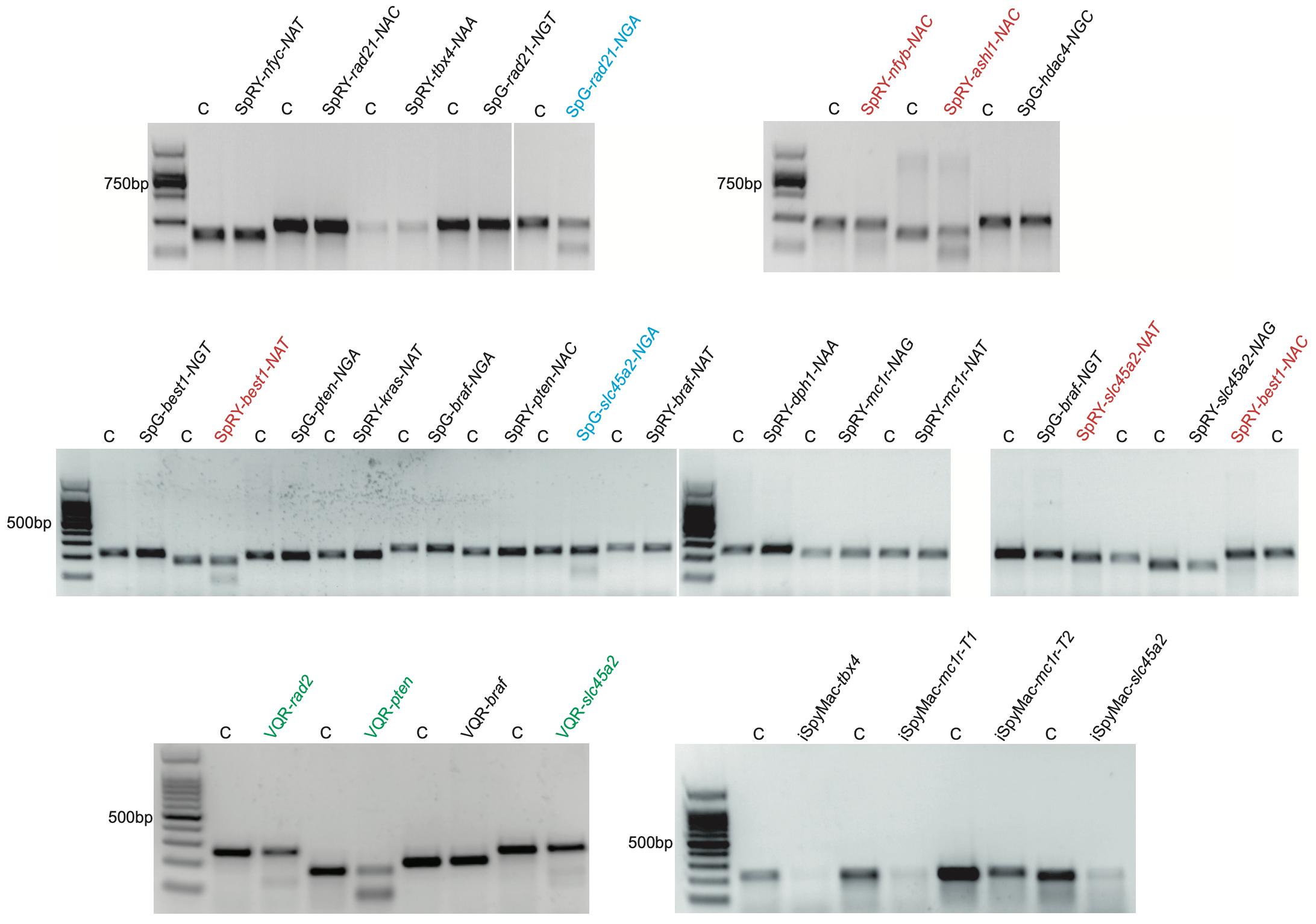 Fig. S3. T7EI assay data show the mutagenic activities of VQR Cas9, SpG Cas9, SpRY Cas9, and iSpyMac in X. tropicalis embryos. The targeting sites labelled in red, blue, and green are the effective ones for SpRY Cas9, SpG Cas9, and VQR Cas9, respectively. For target site designation, in addition to the gene name, the name of the Cas9 variant is used as a prefix and in some cases either the PAM motif or T1/T2 is indicated as a suffix.