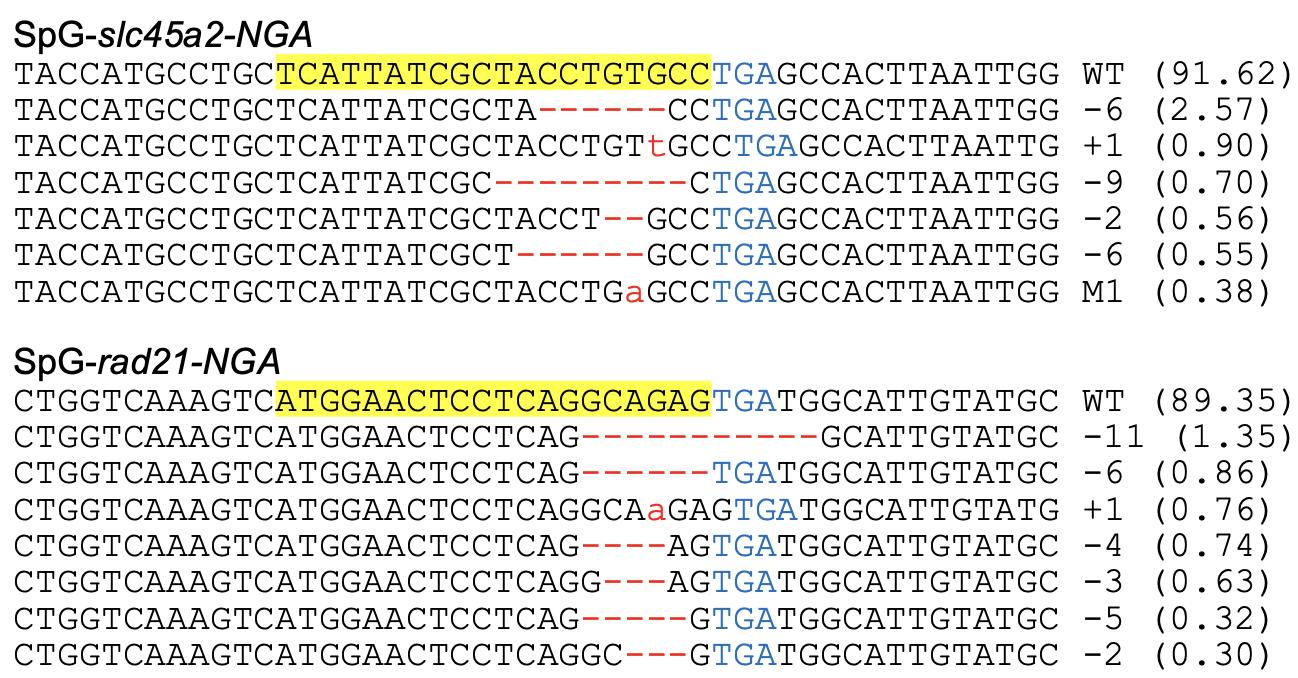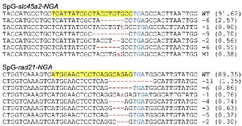 Fig. S5. DNA deep-sequencing data show the mutations induced by SpG Cas9 targeting the genes showed in Fig. 3a. For all the panels, the wild-type sequence is shown at the top with the target site highlighted in yellow and the PAM sequence in blue text. Red dashes indicate deletions and lowercase letters in red indicate insertions or mutations. The numbers in parentheses show the percentage of this sequence in total sequencing reads.