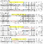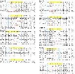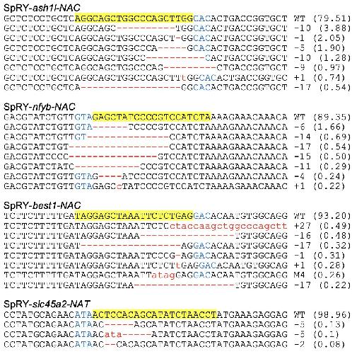 Fig. S6. DNA deep-sequencing data show the mutations induced by SpRY Cas9 targeting the genes showed in Fig. 3a. For all the panels, the wild-type sequence is shown at the top with the target site highlighted in yellow and the PAM sequence in blue text. Red dashes indicate deletions and lowercase letters in red indicate insertions or mutations. The numbers in parentheses show the percentage of this sequence in total sequencing reads. For target site designation, in addition to the gene name, the name of the Cas9 variant is used as a prefix and the PAM motif is indicated as a suffix.