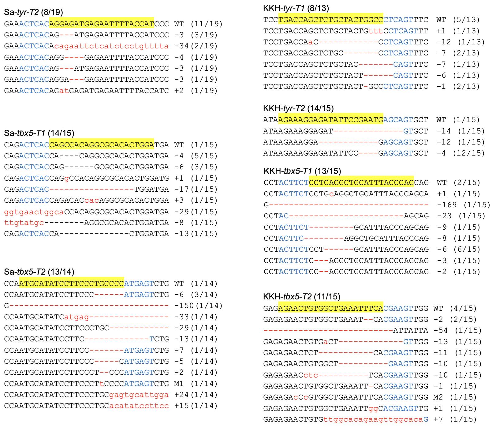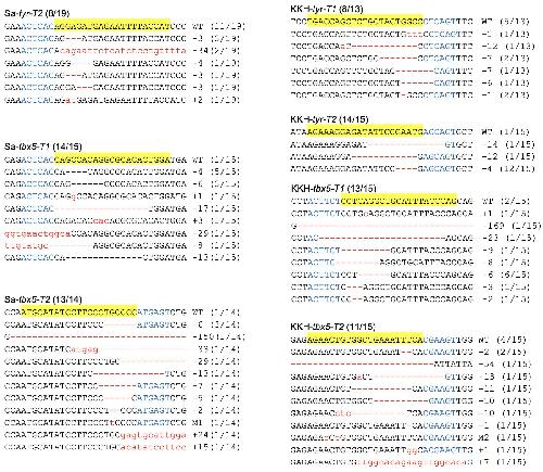 Fig. S9. Sanger DNA sequencing data show the mutations induced by SaCas9 and KKH SaCas9 targeting the genes showed in Fig. 5. For all the panels, the wild-type sequence is shown at the top with the target site highlighted in yellow and the PAM sequence in blue text. Red dashes indicate deletions and lowercase letters in red indicate insertions or mutations. The numbers in parentheses indicate ratio of this sequence in the total colonies sequenced. For target site designation, the gene name is in the middle, the prefixes Sa- and KKH- represent SaCas9 and KKH SaCas9, respectively. The suffixes -T1 and -T2 represent the first and the second target site designed in a given gene, respectively.