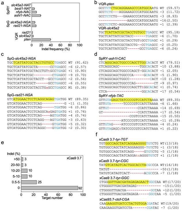 Figure 3. VQR Cas9, SpG Cas9, SpRY Cas9 and xCas9 3.7 have limited genome editing efficacy in X. tropicalis. a VQR Cas9, SpG Cas9, and SpRY Cas9 induced indel frequency in X. tropicalis embryos, as detected by deep-sequencing. bâd Some of the deep-sequencing data show the mutations induced by VQR Cas9, SpG Cas9, and SpRY Cas9. The wild-type sequence is shown at the top with the target site highlighted in yellow and the PAM sequence in blue text. Red dashes indicate deletions and lowercase letters in red indicate insertions or mutations. For all panels, the numbers in parentheses show the percentage of this sequence in the total sequence reads. e Summary of the xCas9 3.7 targeted genome-editing efficiency based on gray value analyses of the T7EI data. f DNA sequences show xCas9 3.7 induced mutations, as detected by Sanger DNA sequencing. For each panel, the wild-type sequence is shown at the top with the target site highlighted in yellow and the PAM sequence in blue text. Red dashes indicate deletions and lowercase letters in red indicate insertions or mutations. The numbers in parentheses represent the ratio of this sequence in the total colonies sequenced. For target site designation, in addition to the gene name, the name of the Cas9 variant is used as a prefix and in some cases the PAM motif is indicated as a suffix