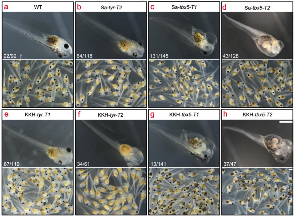Figure 5. SaCas9 and KKH SaCas9 mediated genome editing are efficient enough for G0 phenotyping in X. tropicalis. a Wild-type stage 44 tadpoles. b Stage 44 tadpoles show minor perturbation of cutaneous and ocular pigmentation upon SaCas9-mediated disruption of tyr. c, d Stage 44 tadpoles show cardiac malformation and edema caused by SaCas9-mediated disruption of tbx5. e, f Stage 44 tadpoles show albinism caused by KKH SaCas9-mediated disruption of tyr. g, h Stage 44 tadpoles show cardiac malformation and edema caused by KKH SaCas9-mediated disruption of tbx5. For bâh, the penetrance of each phenotype is well in line with the corresponding genome editing efficiency. For all panels, the phenotype frequency is given in the representative image. Scale bars, 2 mm. For target site designation, the gene name is in the middle, the prefixes Sa- and KKH- represent SaCas9 and KKH SaCas9, respectively. The suffixes -T1 and -T2 represent the first and the second target site designed in a given gene, respectively