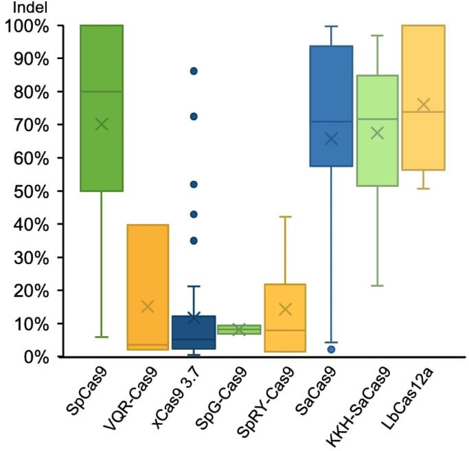 Figure 6. Box plot summary of the targeted genome editing efficiency of 8 Cas variants tested in X. tropicalis embryos. The box plot for SpCas9 is based on the data from our previous studies [21, 24]