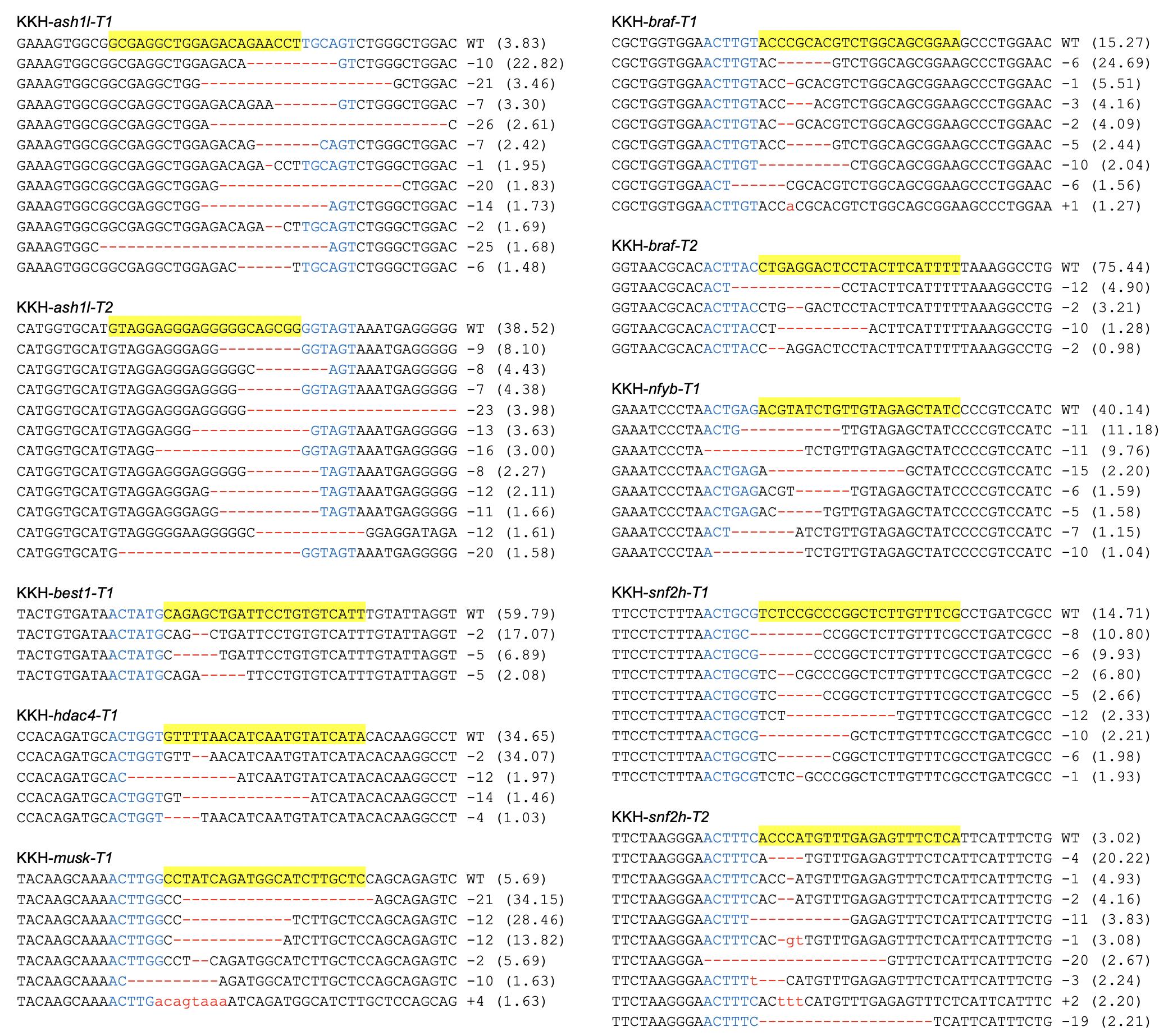Fig. S2. DNA deep-sequencing data show the mutations induced by KKH SaCas9 targeting the genes showed in Fig. 2b. For all the panels, the wild-type sequence is shown at the top with the target site highlighted in yellow and the PAM sequence in blue text. Red dashes indicate deletions and lowercase letters in red indicate insertions or mutations. The numbers in parentheses show the percentage of this sequence in total sequencing reads. For target site designation, the gene name is in the middle, the prefix KKH- represents KKH SaCas9. The suffixes -T1 and - T2 represent the first and the second target site designed in a given gene, respectively.