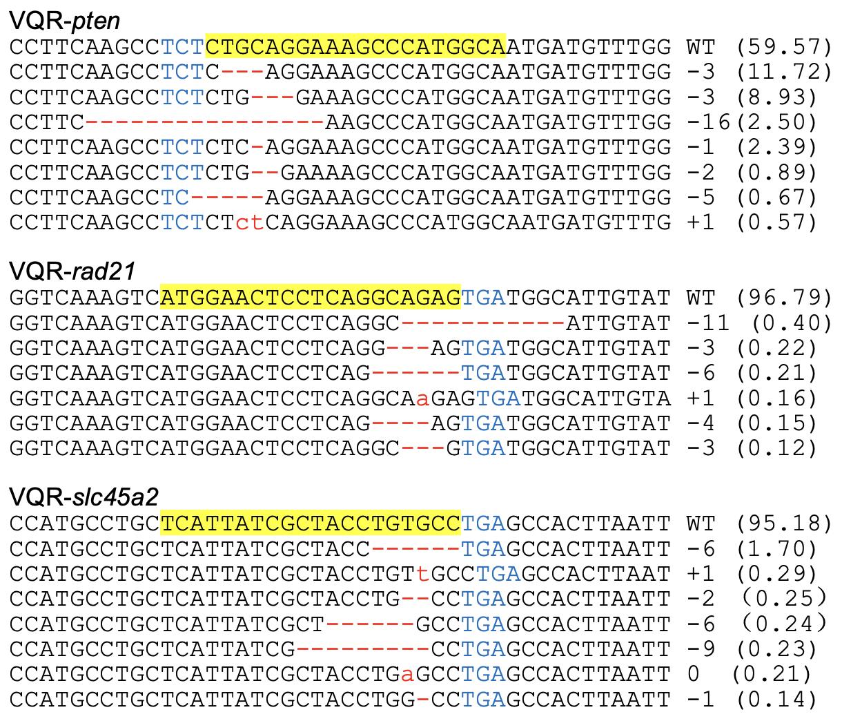 Fig. S4. DNA deep-sequencing data show the mutations induced by VQR Cas9 targeting the genes showed in Fig. 3a. For all the panels, the wild-type sequence is shown at the top with the target site highlighted in yellow and the PAM sequence in blue text. Red dashes indicate deletions and lowercase letters in red indicate insertions or mutations. The numbers in parentheses show the percentage of this sequence in total sequencing reads.