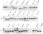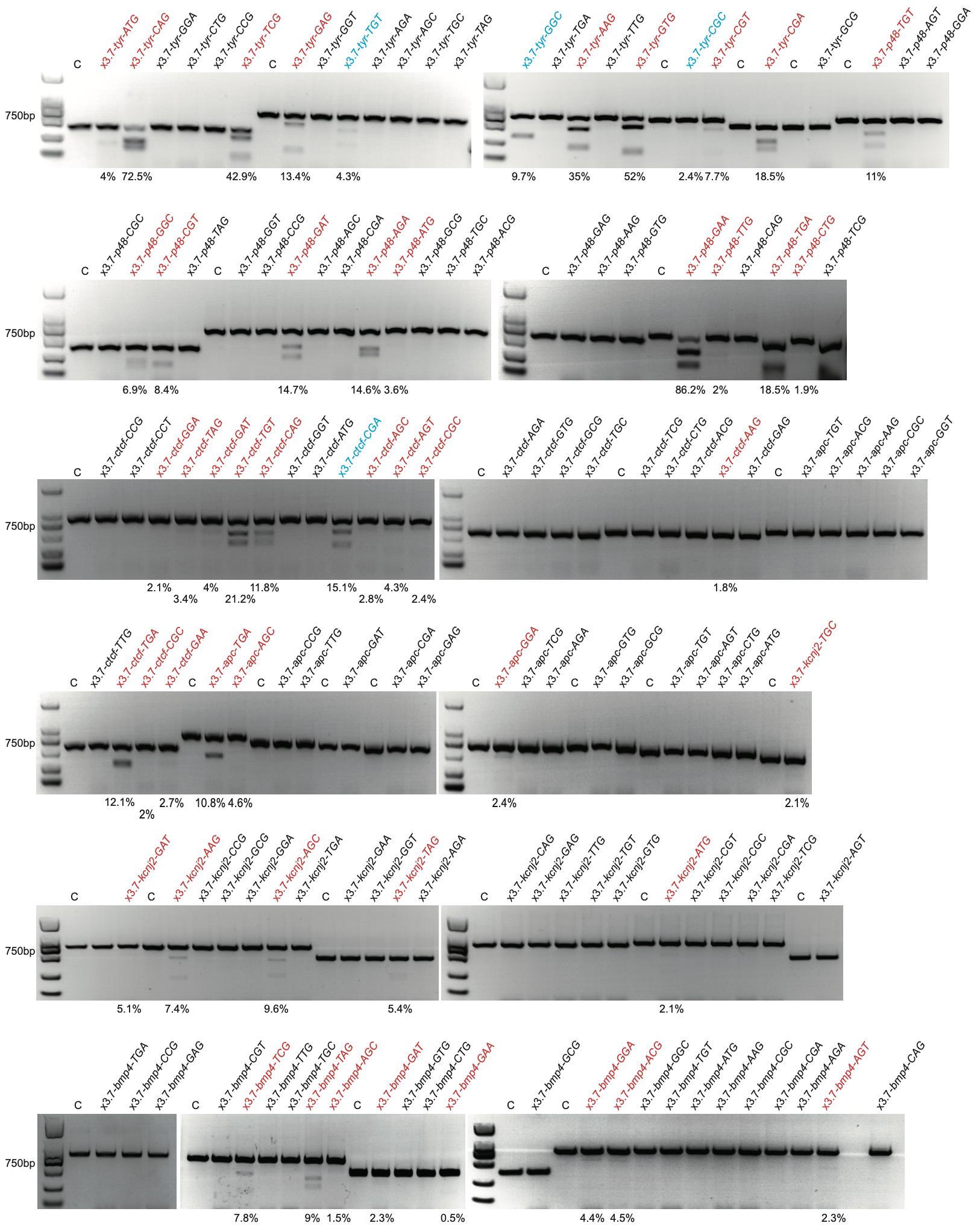 Fig. S7. T7EI assay data show the mutagenic activities of xCas9 3.7 targeting non-NGG PAM sites in X. tropicalis embryos. The targeting sites labelled in red and blue are the effective ones with their effective gray values indicated at the bottom. The blue ones have been further verified by Sanger DNA sequencing. C, control. For target site designation, in addition to the gene name, the name of the Cas9 variant is used as a prefix and the PAM motif is indicated as a suffix.