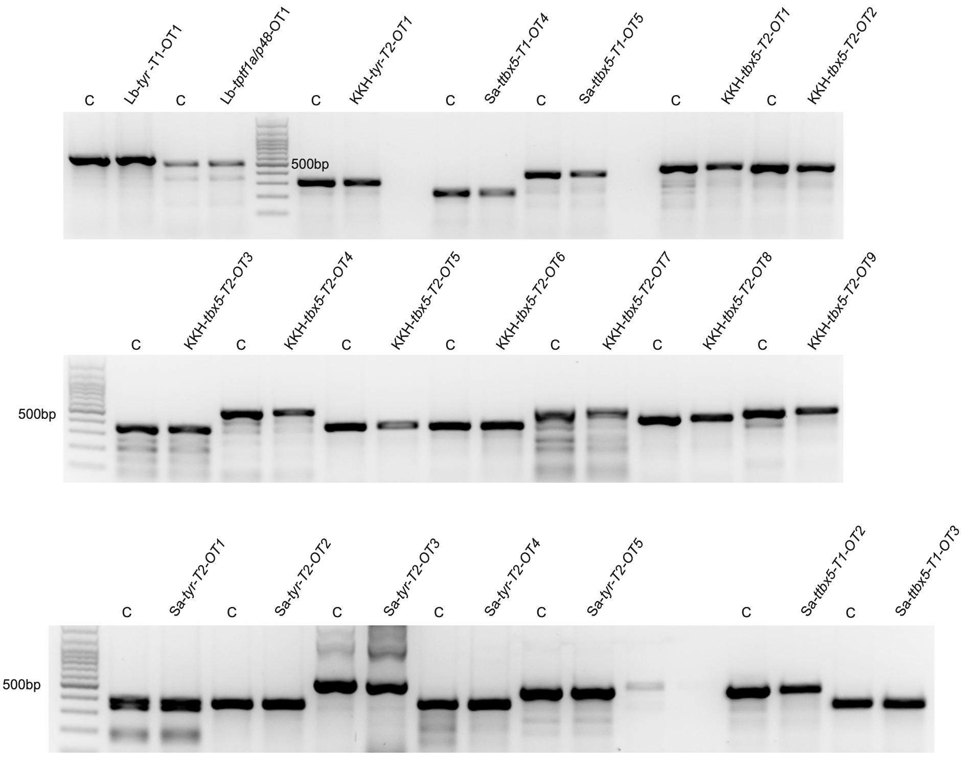 Fig. S10. T7EI assay data show no discernible mutagenic activities on potential off-target sites for LbCas12a, SaCas9, and KKH SaCas9 in X. tropicalis embryos. Potential off-target (OT) site is indicated as the last suffix. C, control.