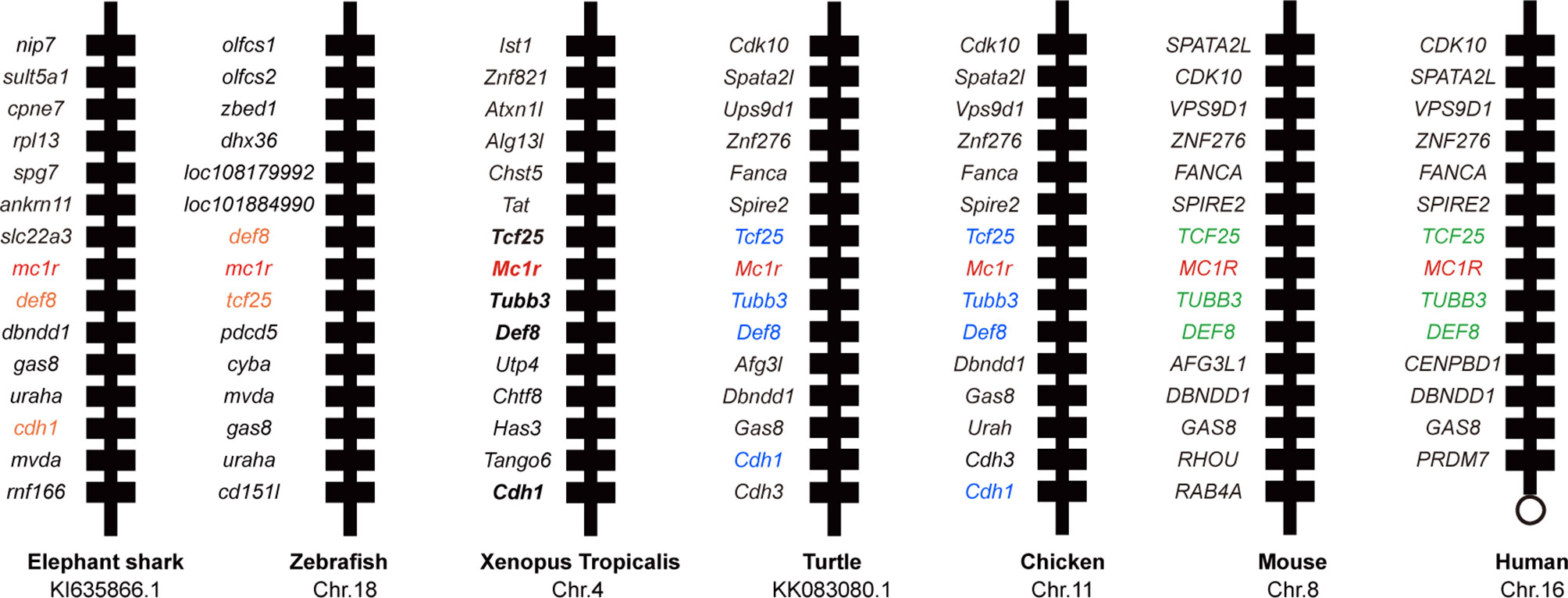 Figure 2. Synteny analysis of Xenopus tropicalis mc1r. Synteny mapping of mc1rs among with Callorhinchus milii (elephant shark), Danio rerio (zebrafish), Xenopus tropicalis, Chrysemys picta bellii (turtle), Gallus gallus (chicken), Mus musculus (house mouse), and Homo sapiens (human). Positional conserved genes among multiple species are marked with color.