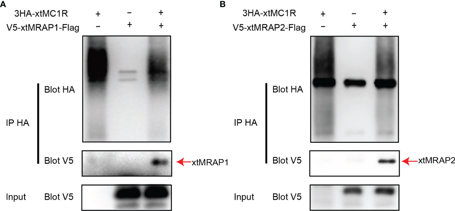 FIGURE 4 Investigation of the direct Protein interaction of xtMraps and xtMc1r proteins in vitro. (A) Co-immunoprecipitation of the HA-xtMc1r and Flag-xtMrap1 protein complex. (B) Co-immunoprecipitation of HA-xtMc1r and Flag-xtMrap2 protein complex.