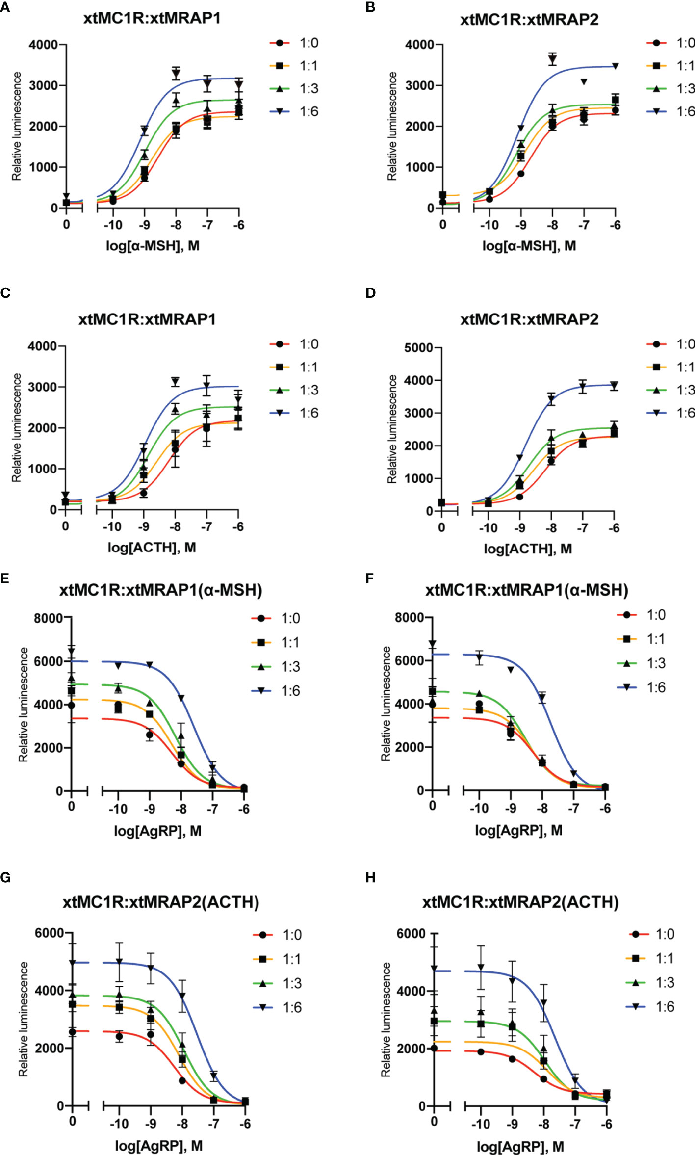 Figure 6. Pharmacological modulation of xtMc1r signaling by xtMrap proteins. (A–D) Dose-responsive cAMP level of α-MSH (0 M, 10−11 to 10−6 M) and ACTH (0 M, 10−11 to 10−6 M) stimulated xtMc1r in presence of different amounts of xtMrap1(A, C) and xtMrap2 (B, D). Data were represented as the mean ± SEM from three independent experiments (E–H). The antagonistic effect of AgRP (10−11 to 10−6 M) to the EC80 dosage of α-MSH (E, F) or ACTH (G, H) induced xtMc1r signaling in presence of different amounts of xtMrap1(E, G) or xtMrap2 (F, H). Data were represented as the mean ± SEM from three independent experiments.