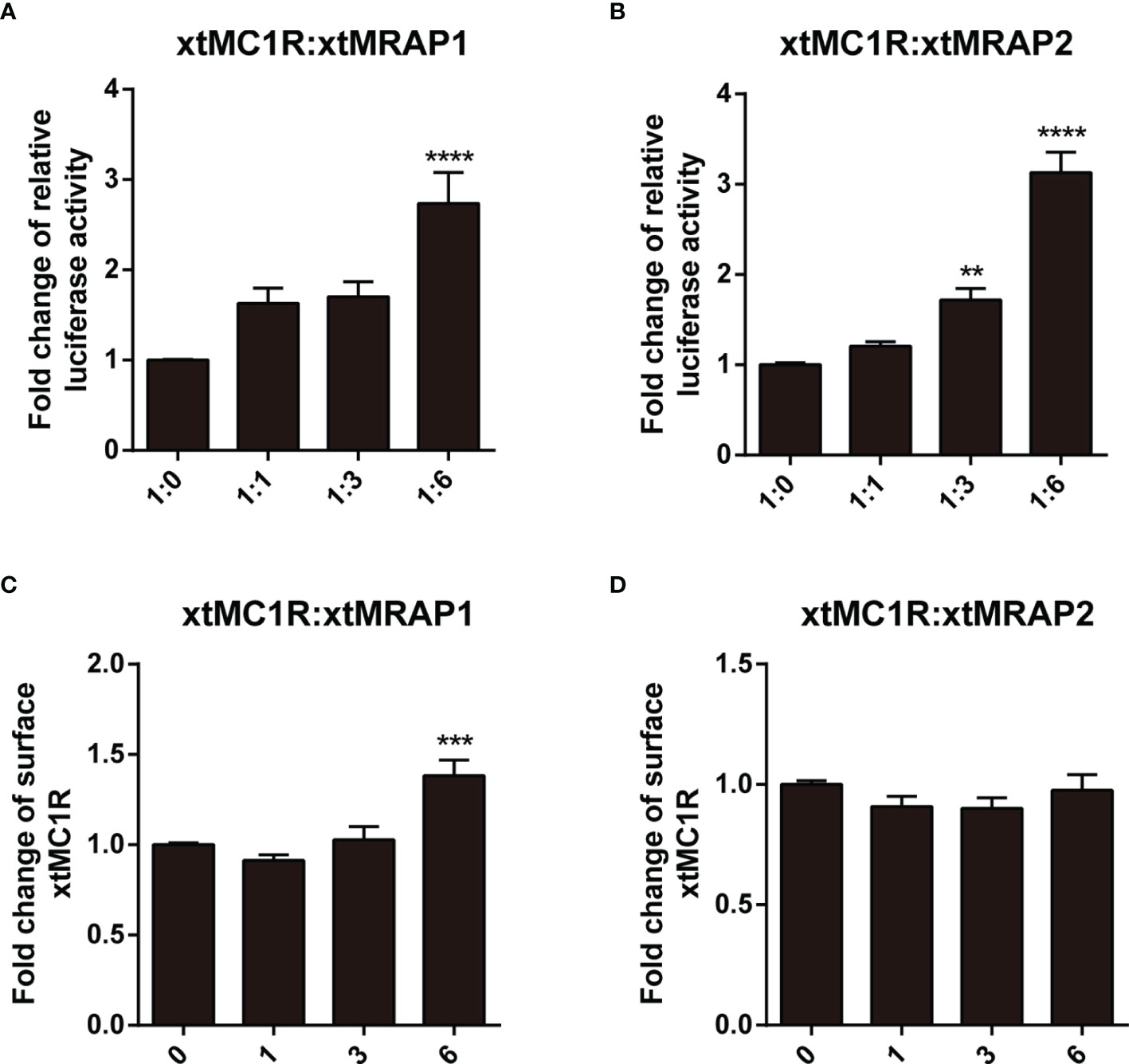 FIGURE 7 Measurement of the constitutive activity and surface translocation of xtMcar by xtMrap proteins. The constitutive activity of xtMc1r in the presence of xtMrap1 (A) or xtMrap2 (B) at ratio of 1:0, 1:1, 1:3, and 1:6. Surface expression level of the HA-tagged xtMc1r in the presence of xtMrap1 (C) or xtMrap2 (D) at ratio of 1:0, 1:1, 1:3, and 1:6. Data were represented as the mean ± SEM from three independent experiments. **p < 0.01, ∗∗∗p < 0.001 and ∗∗∗∗p < 0.0001.