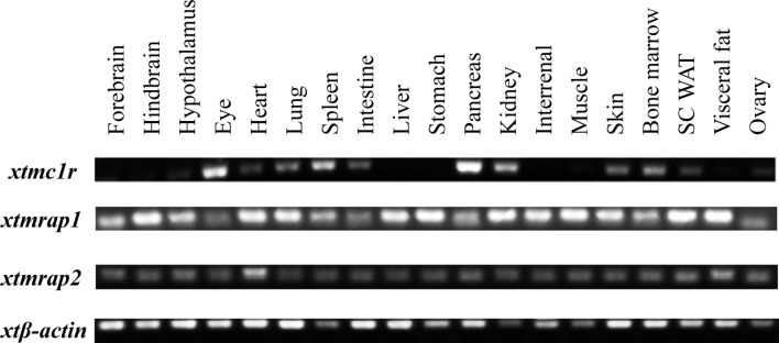 Figure 3. Expressional analysis of mc1r transcript in multiple tissues of Xenopus tropicalis. Expression profiles of mc1r, mrap2, and mrap2 transcript in 19 tissues from an adult female Xenopus tropicalis. Housekeeping gene β-actin was used as an internal control.