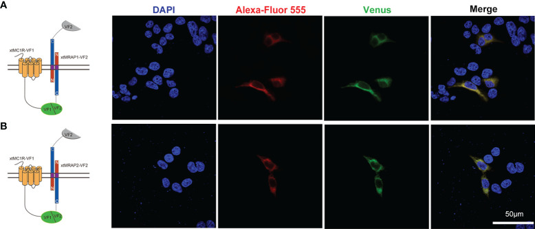 Figure 5. Functional protein complex of xtMc1r and xtMraps on plasma membrane. (A) Formation of functional protein complex of xtMc1r and xtMrap1 on the plasma membrane. (B) Formation of functional protein complex of xtMc1r and xtMrap2 on the plasma membrane. Nuclei were shown in blue (DAPI). Scale bar = 50 μm.