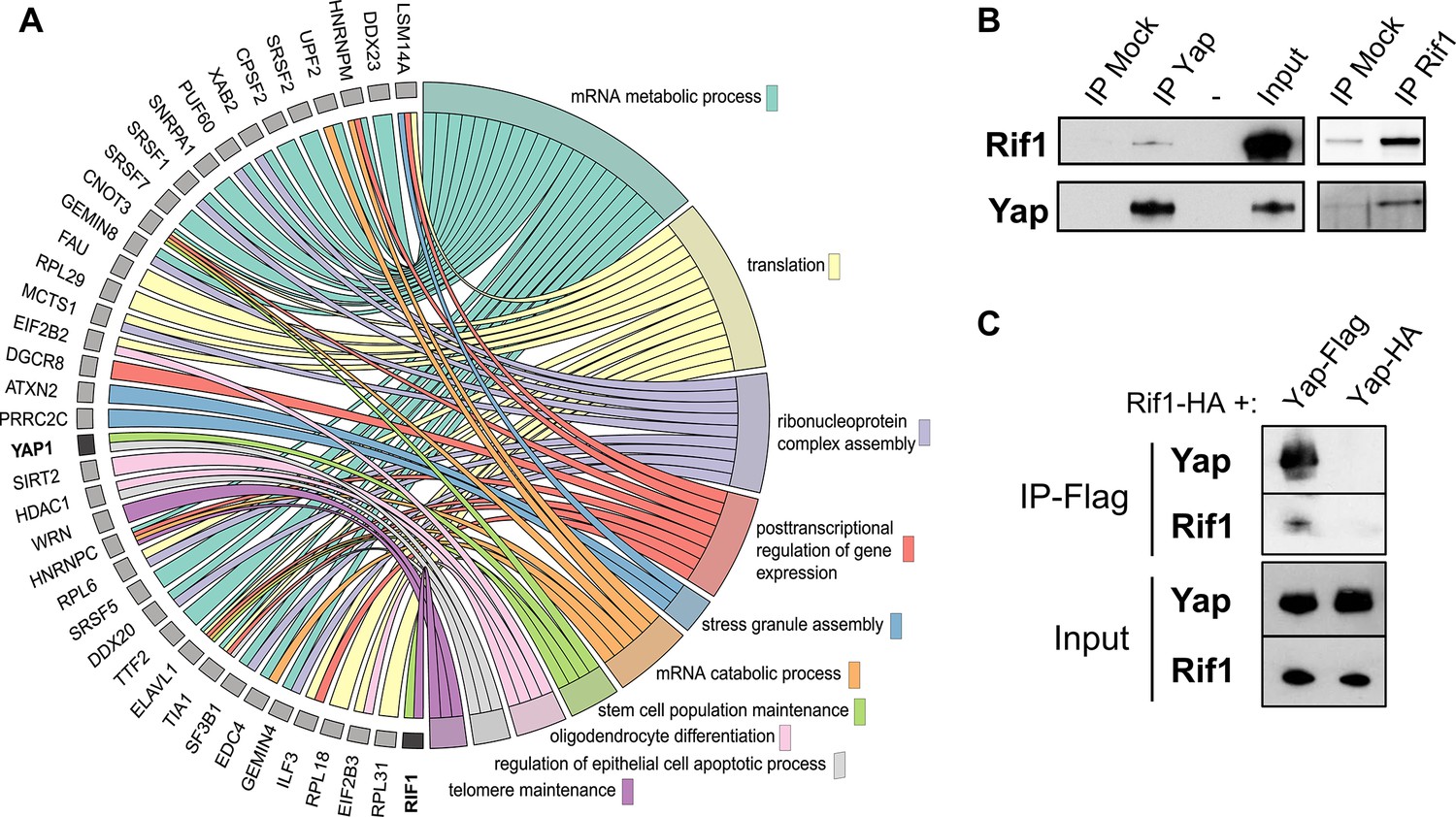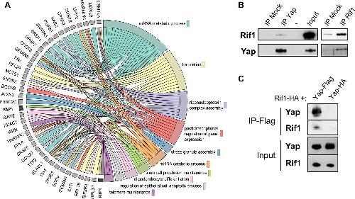 Figure 3. Rif1 interacts with Yap. (A) Chord plot representation related to GO annotations belonging to biological processes of proteins enriched by at least threefold in Yap versus control co-immunoprecipitations performed in S-phase egg extracts. Note that Yap and Rif1 are both functionally associated with stem cell population maintenance (light green). (B) Anti-Yap (IP Yap), anti-Rif1 (IP Rif1), or control (IP Mock) antibodies coupled to Sepharose beads were incubated in S-phase egg extracts; immunoprecipitates were subjected to gel electrophoresis and western blotted using the indicated antibodies. -, unloaded lane. (C) Extracts from HEK293T cells transfected with the indicated tagged constructs were immunoprecipitated using anti-Flag antibodies. The input and immunoprecipitates were subjected to gel electrophoresis and western blotted using the indicated antibodies. |