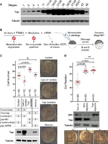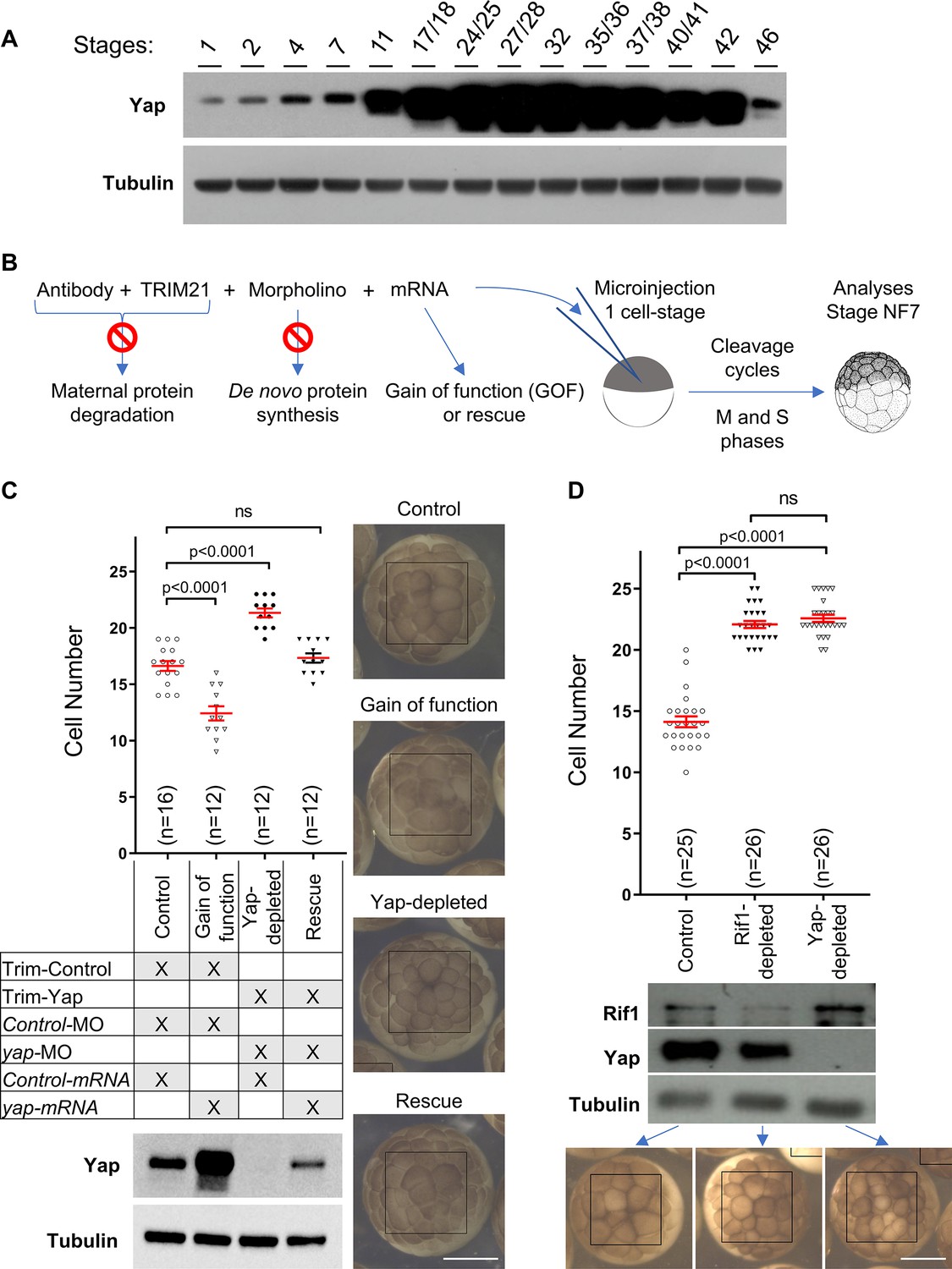 Figure 5. Yap and Rif1 depletions accelerate cell cycles in early Xenopus embryos. (A) Time course analysis of Yap expression throughout development by western blot. Tubulin is used as a loading control. (B) Diagram of the experimental procedure used in (C). (C) Evaluation of the number of cells per Xenopus embryo, at stage 7, following Yap expression perturbations. The number of cells per embryo within a defined area (black boxes on the right pictures) was quantified (top panel). Data are shown as individual value plots with error bars (mean ± SEM) in red; Mann-Whitney test; p-values indicated; ns, not significant. X. laevis embryos were microinjected at the one-cell stage as shown in the table to obtain four different levels of Yap expression: unaffected situation (control), gain of function (GOF), loss of function (Yap-depleted) and a restored expression (rescue). Yap levels of expression were monitored by western blot (bottom panel, tubulin is used as a loading control). Representative images of injected embryos are shown on the right. Scale bar = 500 μm. Trim-Control = pre-immune serum + TRIM21; Trim-Yap = anti Yap antibody + TRIM21, Control-MO = control morpholino (MO), yap-MO = morpholino targeting yap mRNA, Control mRNA = GFP mRNA, yap-mRNA = mRNA encoding yap that is non-targetable by the yap-MO. (D) Evaluation of the number of cells in Xenopus embryos at stage 7 within a defined area (black boxes on the bottom pictures) following Yap or Rif1 depletions. The number of cells per embryo was quantified as in (C). Protein depletion efficiencies were assessed by western blot (middle panel). Representative images of injected embryos are shown at the bottom. Scale bar = 500 μm. |