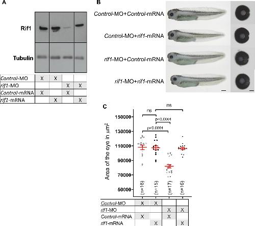 Figure 6. The rif1-MO-induced small eye phenotype is rescued by co-injection with rif1 mRNA. (A) Western blot analysis showing the levels of Rif1 proteins in tadpoles at stage 41 following microinjection at one-cell stage as indicated in the table of either Control-MO or rif1-MO together with GFP-mRNA (Control-mRNA) or rif1-mRNA. Tubulin is used as a loading control. (B) Lateral views and dissected eyes of stage 41 tadpoles following one-cell stage microinjection of MO and mRNA as indicated. (C) Quantification of dissected eye areas. The rif1-MO-induced small eye phenotype is rescued by co-injection of rif1 mRNA. Of note a suboptimal dose of rif1 mRNA was used for the rescue experiment so that it does not alone generate any eye phenotype. The number of analysed tadpoles is indicated for each condition. Data are shown as individual value plots with error bars (mean ± SEM in red; Mann-Whitney test, p-values indicated). Scale bar = 500 μm for tadpoles and 50 μm for dissected eyes. |