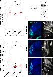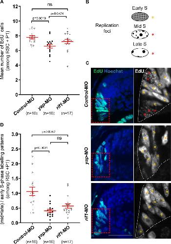 Figure 7. rif1 loss of function affects DNA replication timing in retinal stem/early progenitor cells. (A) One-cell stage embryos were microinjected with either the control-MO (Control), yap-MO or rif1-MO and analysed for EdU-labelling (1 hr-pulse) at stage 41. Quantifications of EdU+ cell number in the retinal stem cells (RSC) and early progenitors (P1) regions (see diagram shown in Figure 6A). The number of analysed retinas is indicated for each condition. Data are shown as individual value plots with error bars (mean ± SEM in red; Mann-Whitney test; p-values indicated; ns, non-significant). (B) Schematic representation of the replication foci observed during S-phase progression as inferred from EdU labelling. Orange stars indicate typical early S replication patterns (homogeneous staining) while red stars indicate mid/late S replication ones (punctuated staining). (C) Retinal sections from stage 41 Xenopus tadpoles treated as described in (A). The region enlarged on the right panels is delineated with red dashed lined boxes. The outlines of the CMZ are highlighted by dotted white lines in the enlargements. Nuclei are counterstained with Hoechst. Scale bar = 50 μm. (D) Quantifications of the ratio of (mid + late)/early-like foci patterns in the retinal stem cells (RSC) and early progenitors (P1) regions. The number of analysed retinas is indicated for each condition. Data are shown as individual value plots with error bars (mean ± SEM in red; Mann-Whitney test; p-values indicated; ns, non-significant). |